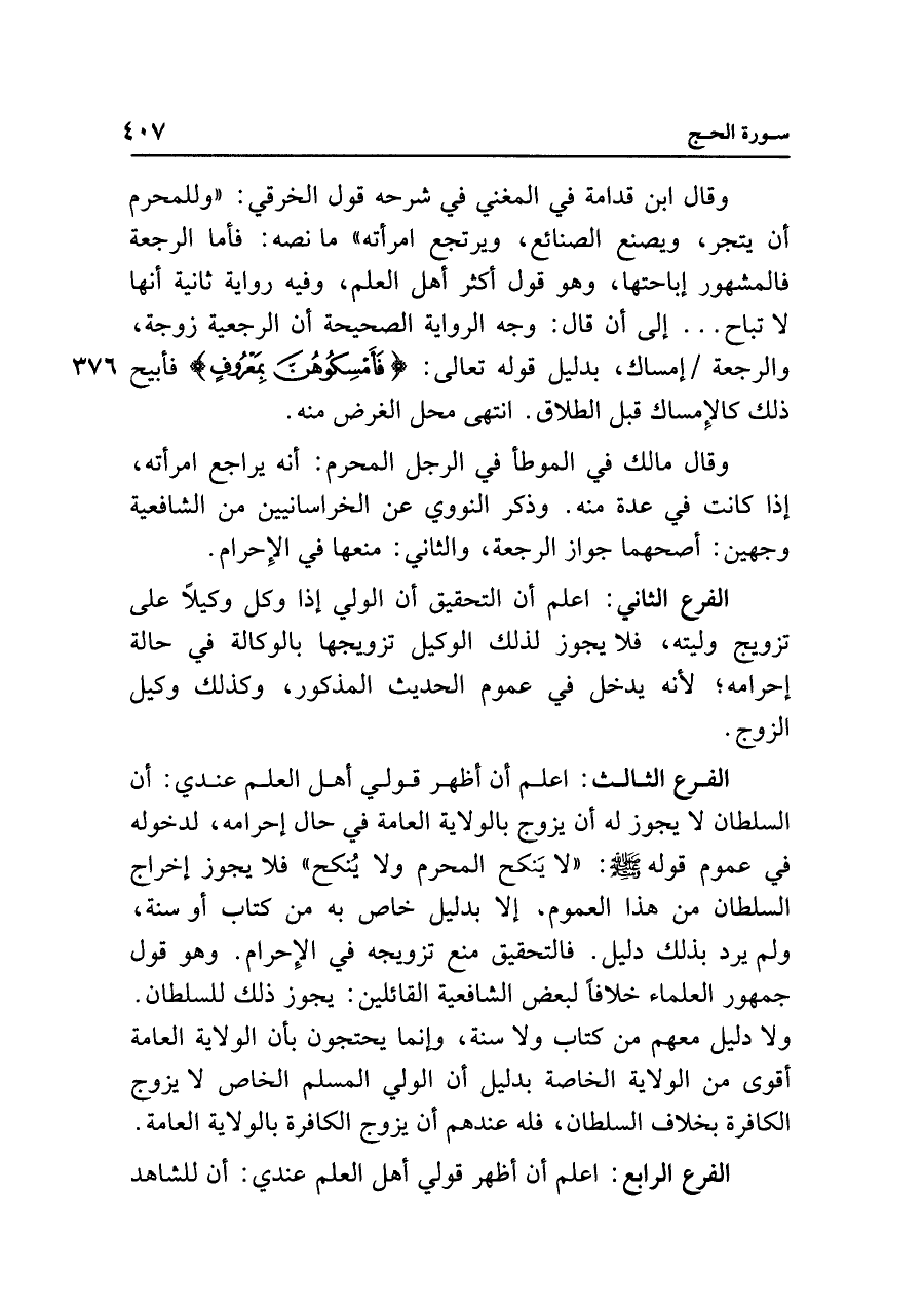 الفرع الثالث: اعلم أن أظهر قولي أهل العلم عندي: أن السلطان لا يجوز له أن يزوج بالولاية العامة في حال إحرامه، لدخوله في عموم قوله - صلى الله عليه وسلم - : "لا يَنكح المحرم ولا يُنكح" فلا يجوز إخراج السلطان من هذا العموم، إلا بدليل خاص به من كتاب أو سنة، ولم يرد بذلك دليل. فالتحقيق منع تزويجه في الإِحرام. وهو قول جمهور العلماء خلافًا لبعض الشافعية القائلين: يجوز ذلك للسلطان. ولا دليل معهم من كتاب ولا سنة، وإنما يحتجون بأن الولاية العامة أقوى من الولاية الخاصة بدليل أن الولي المسلم الخاص لا يزوج الكافرة بخلاف السلطان، فله عندهم أن يزوج الكافرة بالولاية العامة.