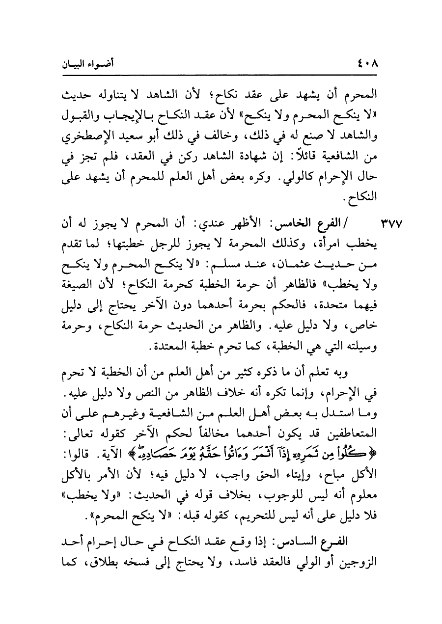 وبه تعلم أن ما ذكره كثير من أهل العلم من أن الخطبة لا تحرم في الإِحرام، وإنما تكره أنه خلاف الظاهر من النص ولا دليل عليه. وما استدل به بعض أهل العلم من الشافعية وغيرهم على أن المتعاطفين قد يكون أحدهما مخالفًا لحكم الآخر كقوله تعالى: {كُلُوا مِنْ ثَمَرِهِ إِذَا أَثْمَرَ وَآتُوا حَقَّهُ يَوْمَ حَصَادِهِ} الآية. قالوا: الأكل مباح، وإيتاء الحق واجب، لا دليل فيه؛ لأن الأمر بالأكل معلوم أنه ليس للوجوب، بخلاف قوله في الحديث: "ولا يخطب" فلا دليل على أنه ليس للتحريم، كقوله قبله: "لا ينكح المحرم".