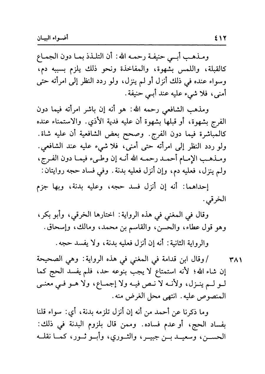 ومذهب الشافعي رحمه الله: هو أنه إن باشر امرأته فيما دون الفرج بشهوة، أو قبلها بشهوة أن عليه فدية الأذي. والاستمناء عنده كالمباشرة فيما دون الفرج. وصحح بعض الشافعية أن عليه شاة. ولو ردد النظر إلى امرأته حتى أمنى، فلا شيء عليه عند الشافعي. ومذهب الإِمام أحمد رحمه الله أنه إن وطئ فيما دون الفرج، ولم ينزل، فعليه دم، وإن أنزل فعليه بدنة. وفي فساد حجه روايتان: