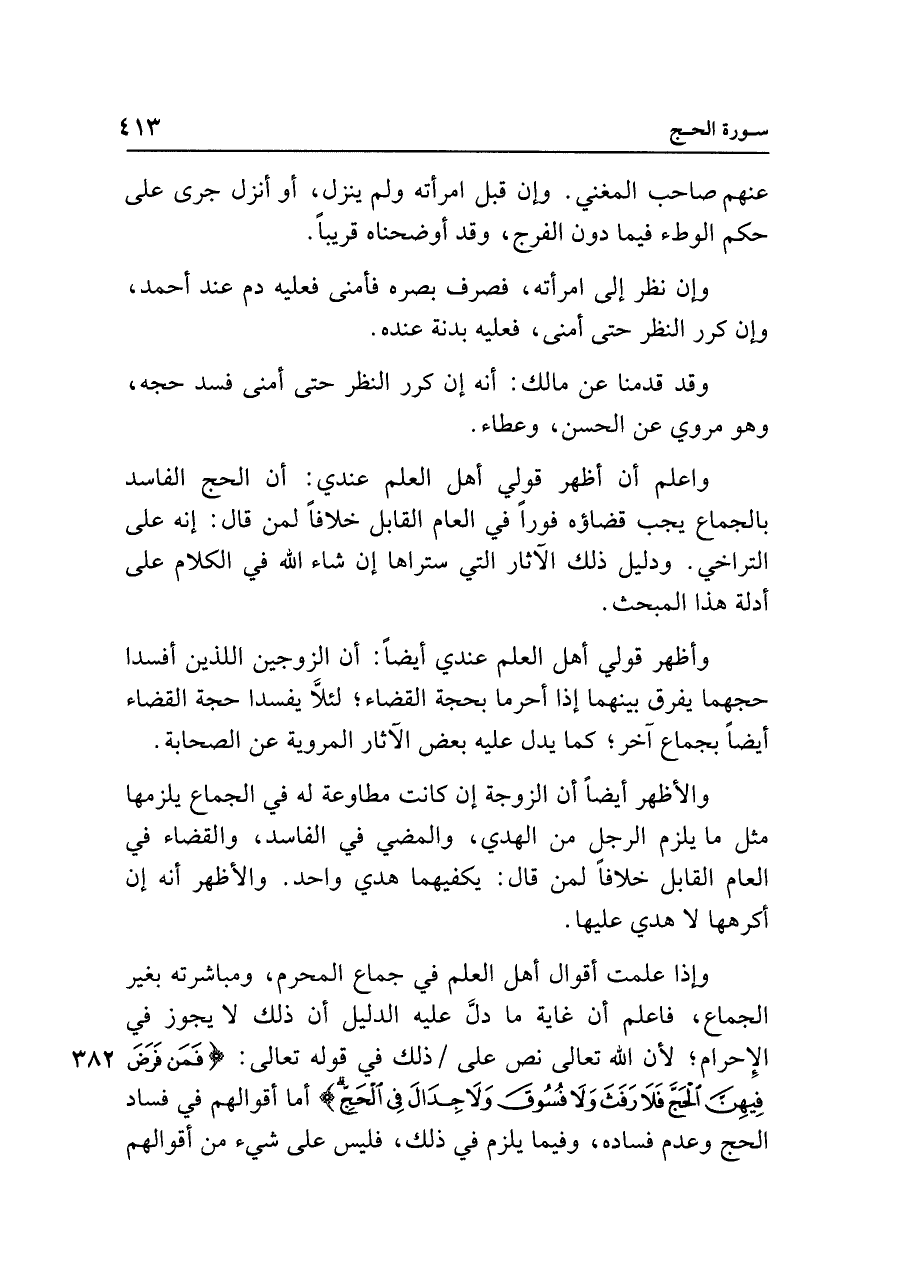 وإذا علمت أقوال أهل العلم في جماع المحرم، ومباشرته بغير الجماع، فاعلم أن غاية ما دلَّ عليه الدليل أن ذلك لا يجوز في الإِحرام؛ لأن الله تعالى نص على ذلك في قوله تعالى: {فَمَنْ فَرَضَ فِيهِنَّ الْحَجَّ فَلَا رَفَثَ وَلَا فُسُوقَ وَلَا جِدَالَ فِي الْحَجِّ} أما أقوالهم في فساد الحج وعدم فساده، وفيما يلزم في ذلك، فليس على شيء من أقوالهم