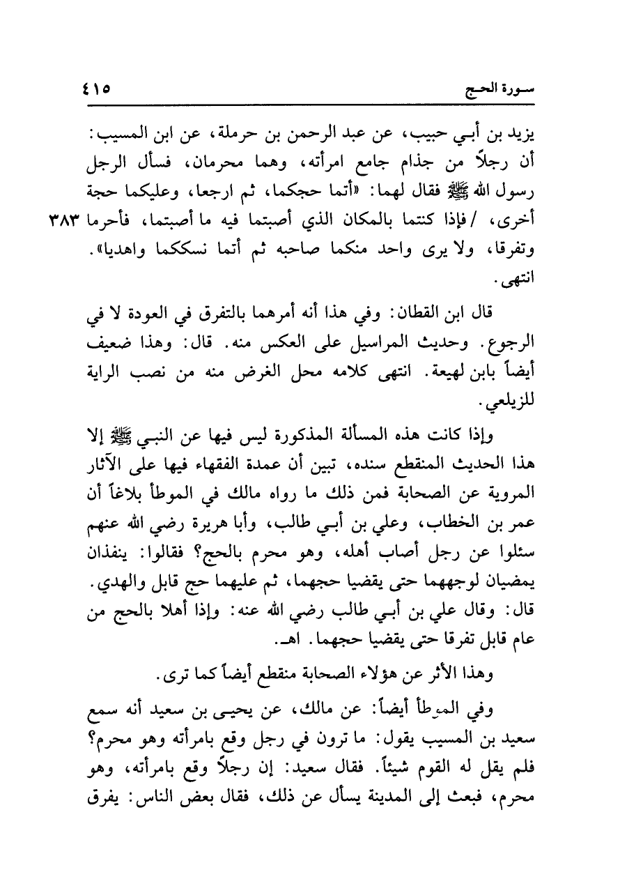 وفي الموطأ أيضًا: عن مالك، عن يحيى بن سعيد أنه سمع سعيد بن المسيب يقول: ما ترون في رجل وقع بامرأته وهو محرم؟ فلم يقل له القوم شيئًا. فقال سعيد: إن رجلًا وقع بامرأته، وهو محرم، فبعث إلى المدينة يسأل عن ذلك، فقال بعض الناس: يفرق