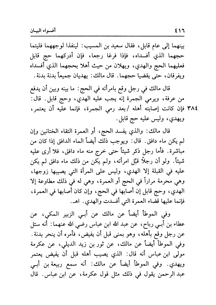 وفي الموطأ أيضًا عن مالك عن أبي الزبير المكي، عن عطاء بن أبي رباح، عن عبد الله ابن عباس رضي الله عنهما: أنه سئل عن رجل وقع بأهله، وهو بمنى قبل أن يفيض، فأمره أن ينحر بدنة. وفي الموطأ أيضًا عن مالك، عن ثور بن زيد الديلي، عن عكرمة مولى ابن عباس أنه قال: الذي يصيب أهله قبل أن يفيض يعتمر ويهدي. وفي الموطأ أيضًا عن مالك: أنه سمع ربيعة بن أبي عبد الرحمن يقول في ذلك مثل قول عكرمة، عن ابن عباس. قال