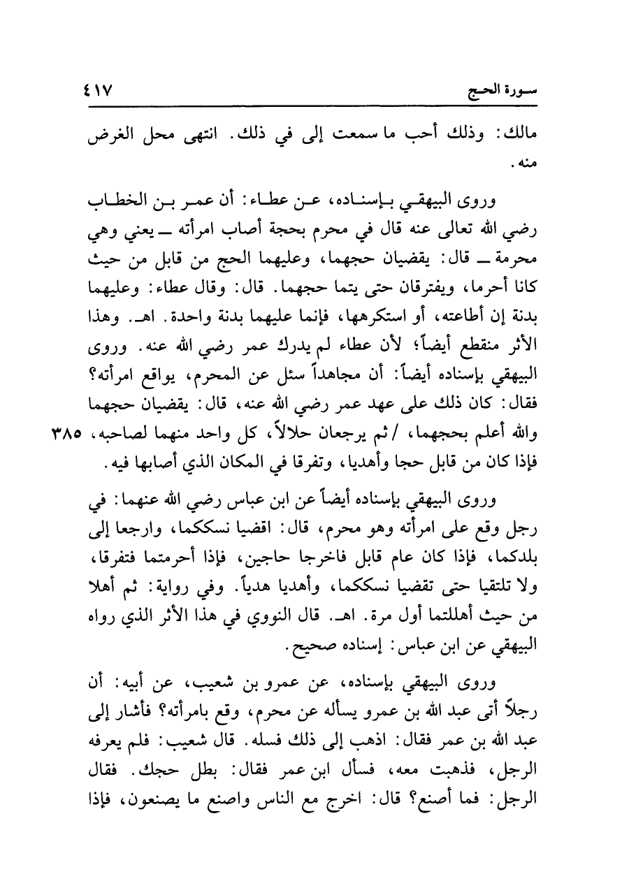 وروى البيهقي بإسناده، عن عمرو بن شعيب، عن أبيه: أن رجلًا أتى عبد الله بن عمرو يسأله عن محرم، وقع بامرأته؟ فأشار إلى عبد الله بن عمر فقال: اذهب إلى ذلك فسله. قال شعيب: فلم يعرفه الرجل، فذهبت معه، فسأل ابن عمر فقال: بطل حجك. فقال الرجل: فما أصنع؟ قال: اخرج مع الناس واصنع ما يصنعون، فإذا