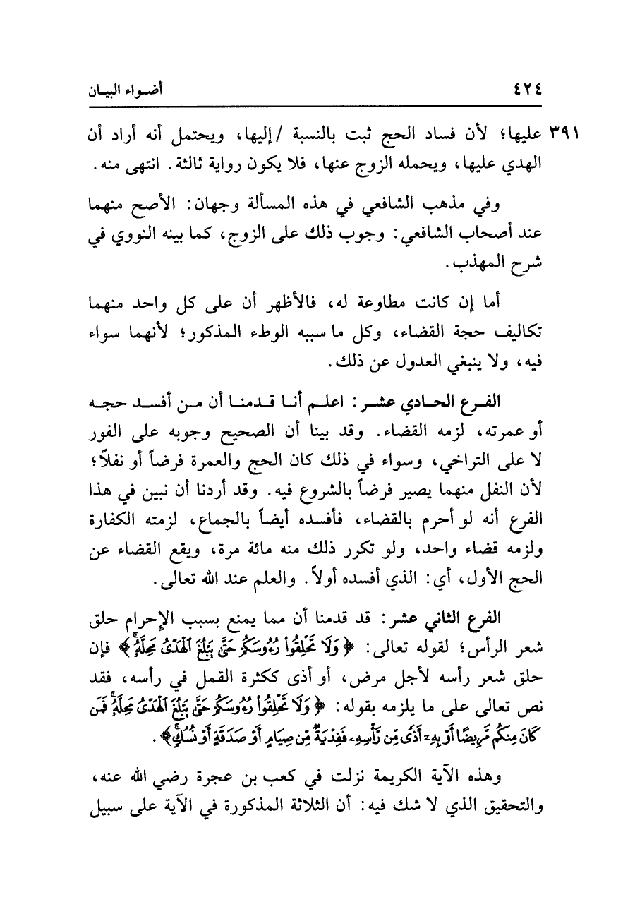 الفرع الثاني عشر: قد قدمنا أن مما يمنع بسبب الإِحرام حلق شعر الرأس، لقوله تعالى: {وَلَا تَحْلِقُوا رُءُوسَكُمْ حَتَّى يَبْلُغَ الْهَدْيُ مَحِلَّهُ} فإن حلق شعر رأسه لأجل مرض، أو أذى ككثرة القمل في رأسه، فقد نص تعالى على ما يلزمه بقوله: {وَلَا تَحْلِقُوا رُءُوسَكُمْ حَتَّى يَبْلُغَ الْهَدْيُ مَحِلَّهُ فَمَنْ كَانَ مِنْكُمْ مَرِيضًا أَوْ بِهِ أَذًى مِنْ رَأْسِهِ فَفِدْيَةٌ مِنْ صِيَامٍ أَوْ صَدَقَةٍ أَوْ نُسُكٍ}.