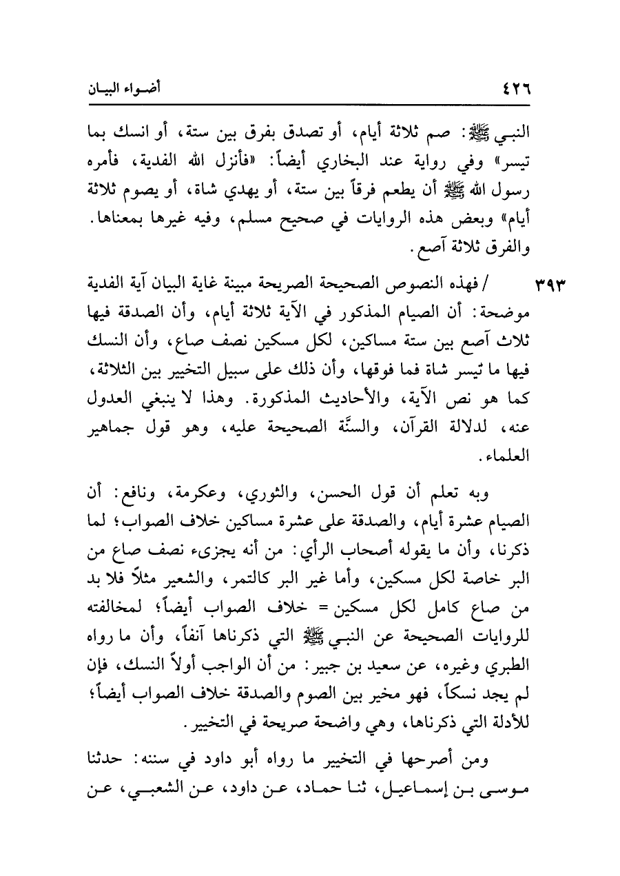 فهذه النصوص الصحيحة الصريحة مبينة غاية البيان آية الفدية موضحة: أن الصيام المذكور في الآية ثلاثة أيام، وأن الصدقة فيها ثلاث آصع بين ستة مساكين، لكل مسكين نصف صاع، وأن النسك فيها ما تيسر شاة فما فوقها، وأن ذلك على سبيل التخيير بين الثلاثة، كما هو نص الآية، والأحاديث المذكورة. وهذا لا ينبغي العدول عنه، لدلالة القرآن، والسنَّة الصحيحة عليه، وهو قول جماهير العلماء.