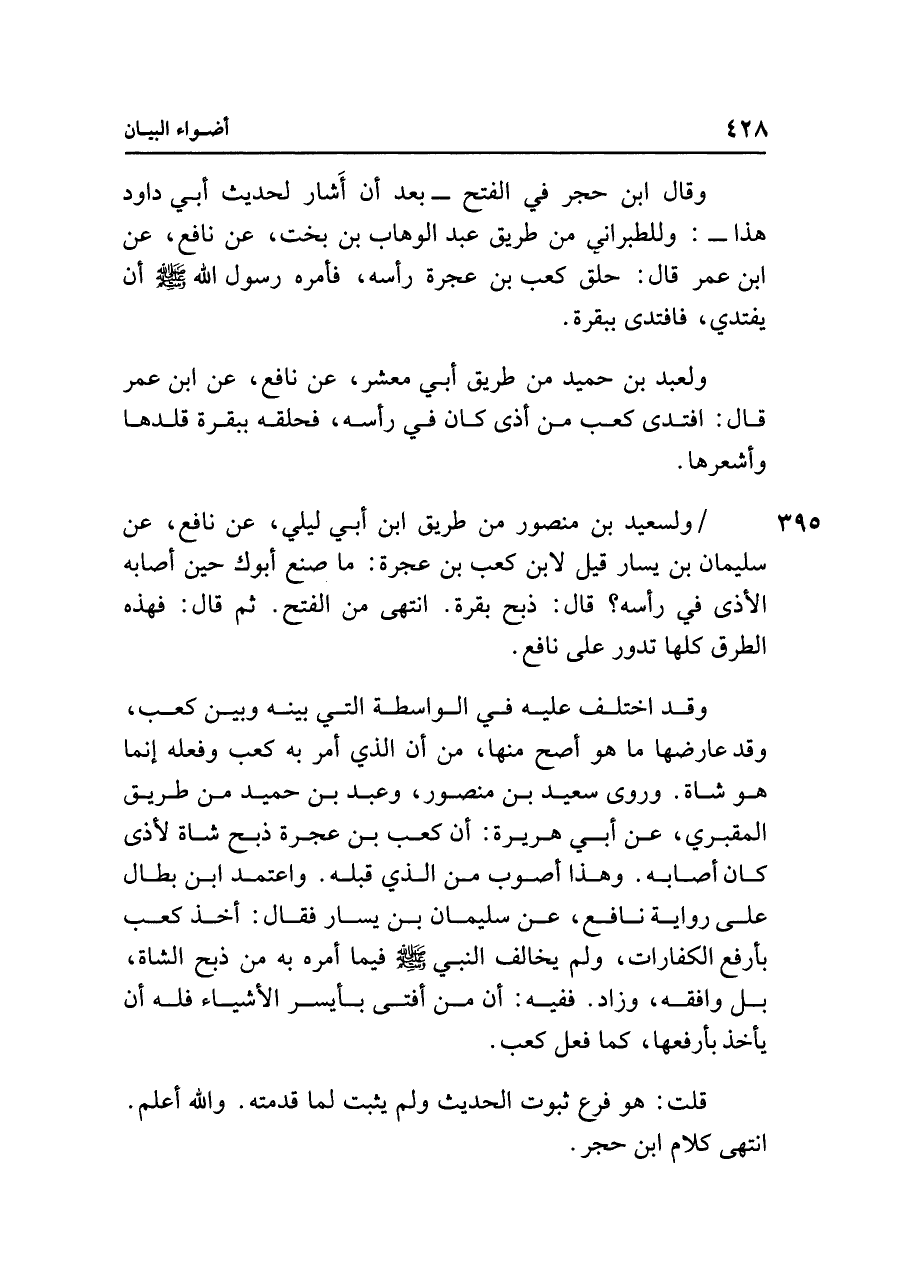 ولسعيد بن منصور من طريق ابن أبي ليلي، عن نافع، عن سليمان بن يسار قيل لابن كعب بن عجرة: ما صنع أبوك حين أصابه الأذى في رأسه؟ قال: ذبح بقرة. انتهى من الفتح. ثم قال: فهذه الطرق كلها تدور على نافع.