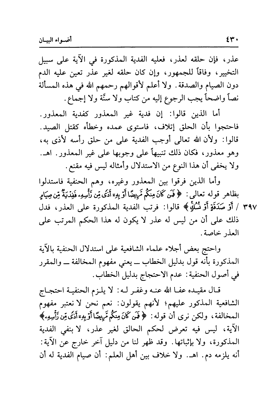 قال مقيده عفا الله عنه وغفر له: لا يلزم الحنفية احتجاج الشافعية المذكور عليهم؛ لأنهم يقولون: نعم نحن لا نعتبر مفهوم المخالفة، ولكن نرى أن قوله: {فَمَنْ كَانَ مِنْكُمْ مَرِيضًا أَوْ بِهِ أَذًى مِنْ رَأْسِهِ} الآية، ليس فيه تعرض لحكم الحالق لغير عذر، لا بنفي الفدية المذكورة، ولا بإثباتها. وقد ظهر لنا من دليل آخر خارج عن الآية: أنه يلزمه دم. اهـ. ولا خلاف بين أهل العلم: أن صيام الفدية له أن
