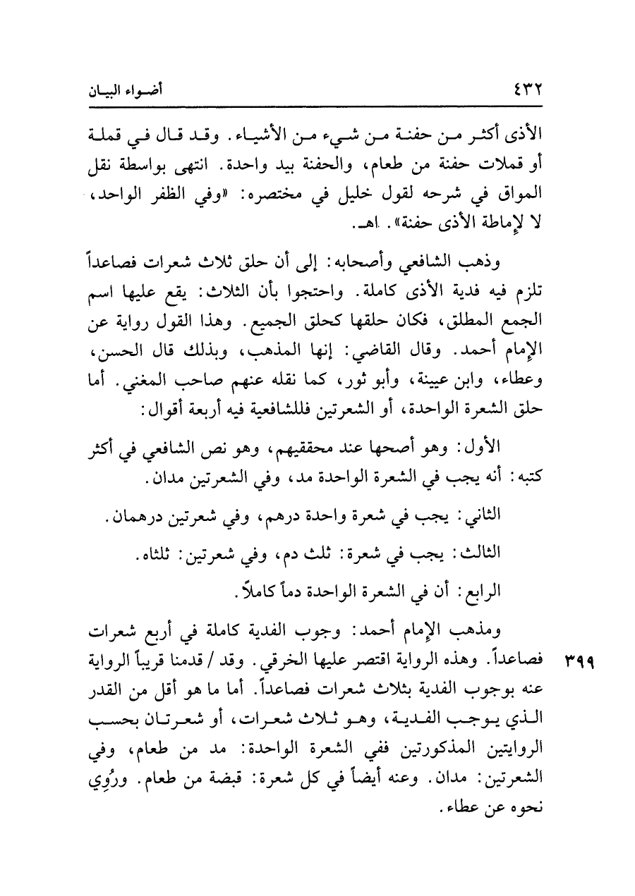 وذهب الشافعي وأصحابه: إلى أن حلق ثلاث شعرات فصاعدًا تلزم فيه فدية الأذى كاملة. واحتجوا بأن الثلاث: يقع عليها اسم الجمع المطلق، فكان حلقها كحلق الجميع. وهذا القول رواية عن الإِمام أحمد. وقال القاضي: إنها المذهب، وبذلك قال الحسن، وعطاء، وابن عيينة، وأبو ثور، كما نقله عنهم صاحب المغني. أما حلق الشعرة الواحدة، أو الشعرتين فللشافعية فيه أربعة أقوال: