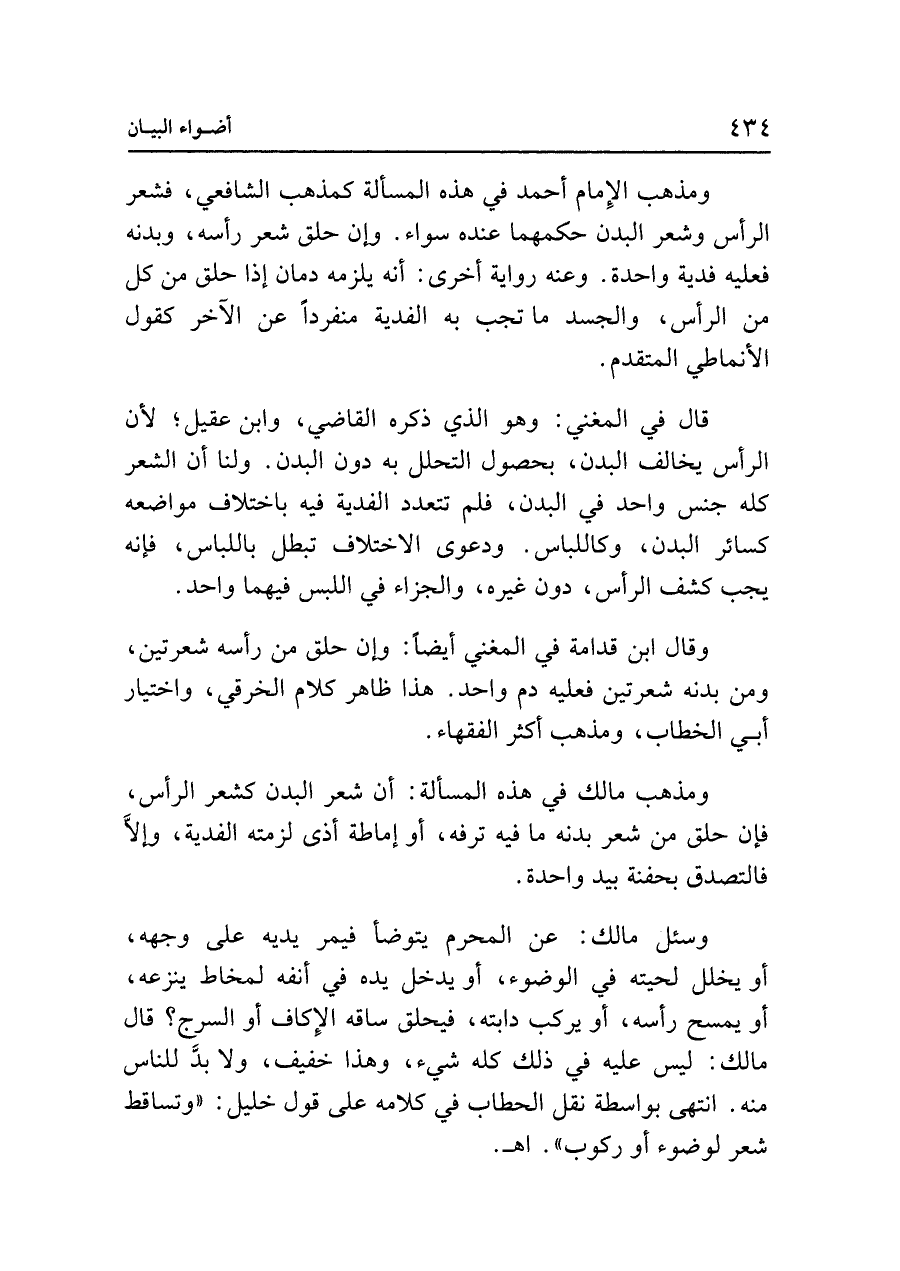 وقال ابن قدامة في المغني أيضًا: وإن حلق من رأسه شعرتين، ومن بدنه شعرتين فعليه دم واحد. هذا ظاهر كلام الخرقي، واختيار أبي الخطاب، ومذهب أكثر الفقهاء.