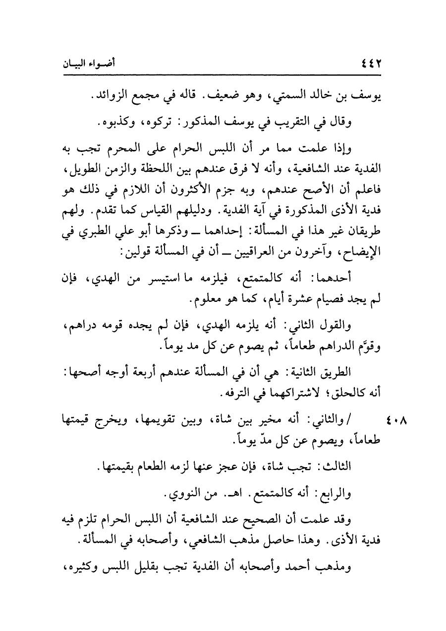 وقد علمت أن الصحيح عند الشافعية أن اللبس الحرام تلزم فيه فدية الأذى. وهذا حاصل مذهب الشافعي، وأصحابه في المسألة.