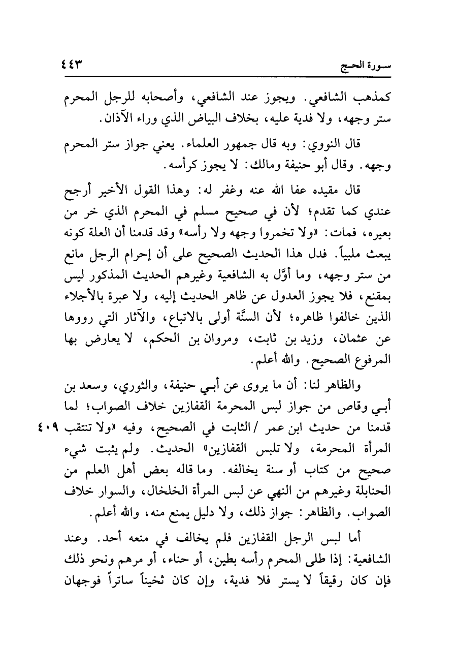 قال مقيده عفا الله عنه وغفر له: وهذا القول الأخير أرجح عندي كما تقدم، لأن في صحيح مسلم في المحرم الذي خر من بعيره، فمات: "ولا تخمروا وجهه ولا رأسه" وقد قدمنا أن العلة كونه يبعث ملبيًا. فدل هذا الحديث الصحيح على أن إحرام الرجل مانع من ستر وجهه، وما أوَّل به الشافعية وغيرهم الحديث المذكور ليس بمقنع، فلا يجوز العدول عن ظاهر الحديث إليه، ولا عبرة بالأجلاء الذين خالفوا ظاهره، لأن السئة أولى بالاتباع، والآثار التي رووها عن عثمان، وزيد بن ثابت، ومروان بن الحكم، لا يعارض بها المرفوع الصحيح. واللَّه أعلم.