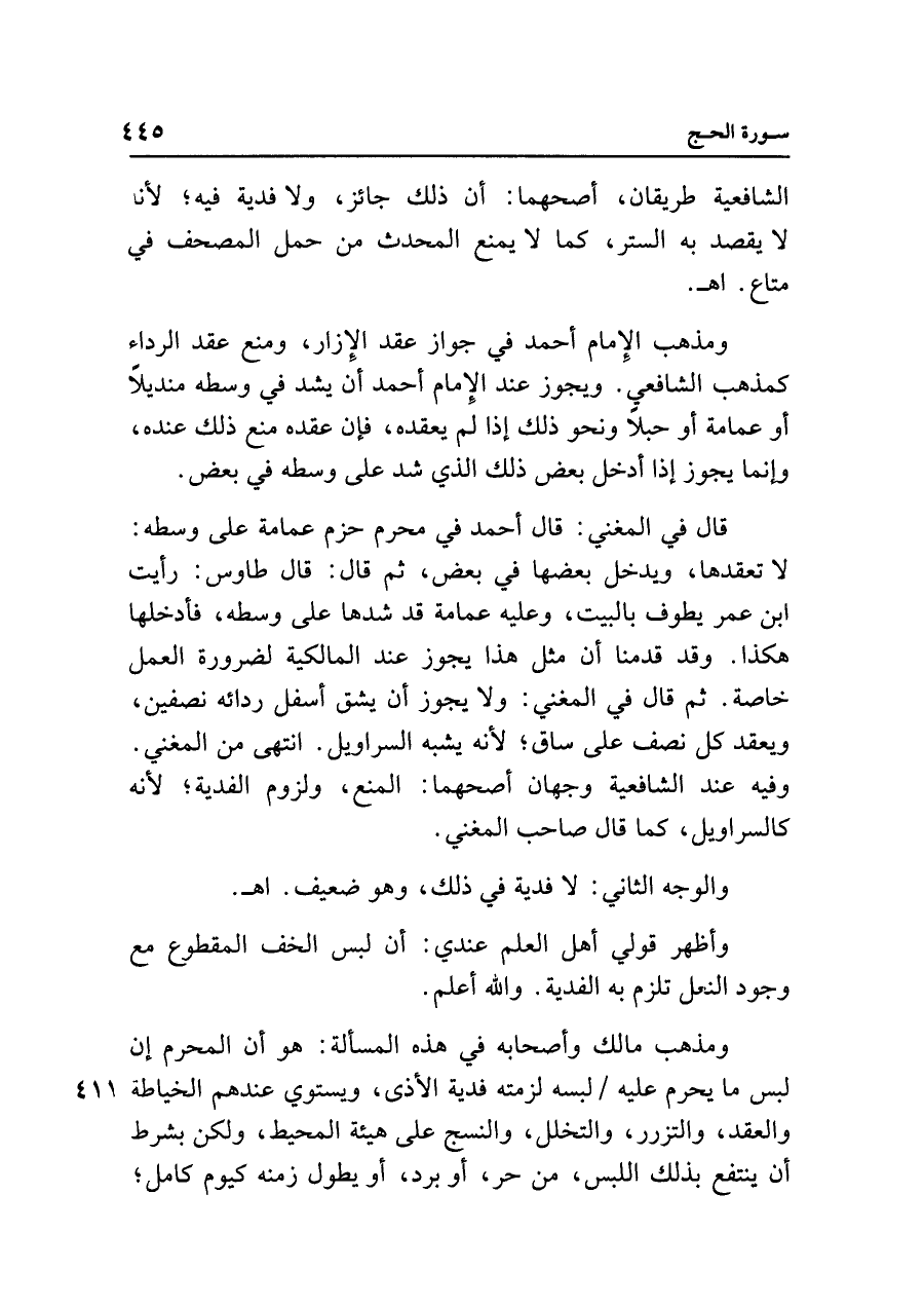 قال في المغني: قال أحمد في محرم حزم عمامة على وسطه: لا تعقدها، ويدخل بعضها في بعض، ثم قال: قال طاوس: رأيت ابن عمر يطوف بالبيت، وعليه عمامة قد شدها على وسطه، فأدخلها هكذا. وقد قدمنا أن مثل هذا يجوز عند المالكية لضرورة العمل خاصة. ثم قال في المغني: ولا يجوز أن يشق أسفل ردائه نصفين، ويعقد كل نصف على ساق، لأنه يشبه السراويل. انتهى من المغني. وفيه عند الشافعية وجهان أصحهما: المنع، ولزوم الفدية، لأنه كالسراويل، كما قال صاحب المغني.