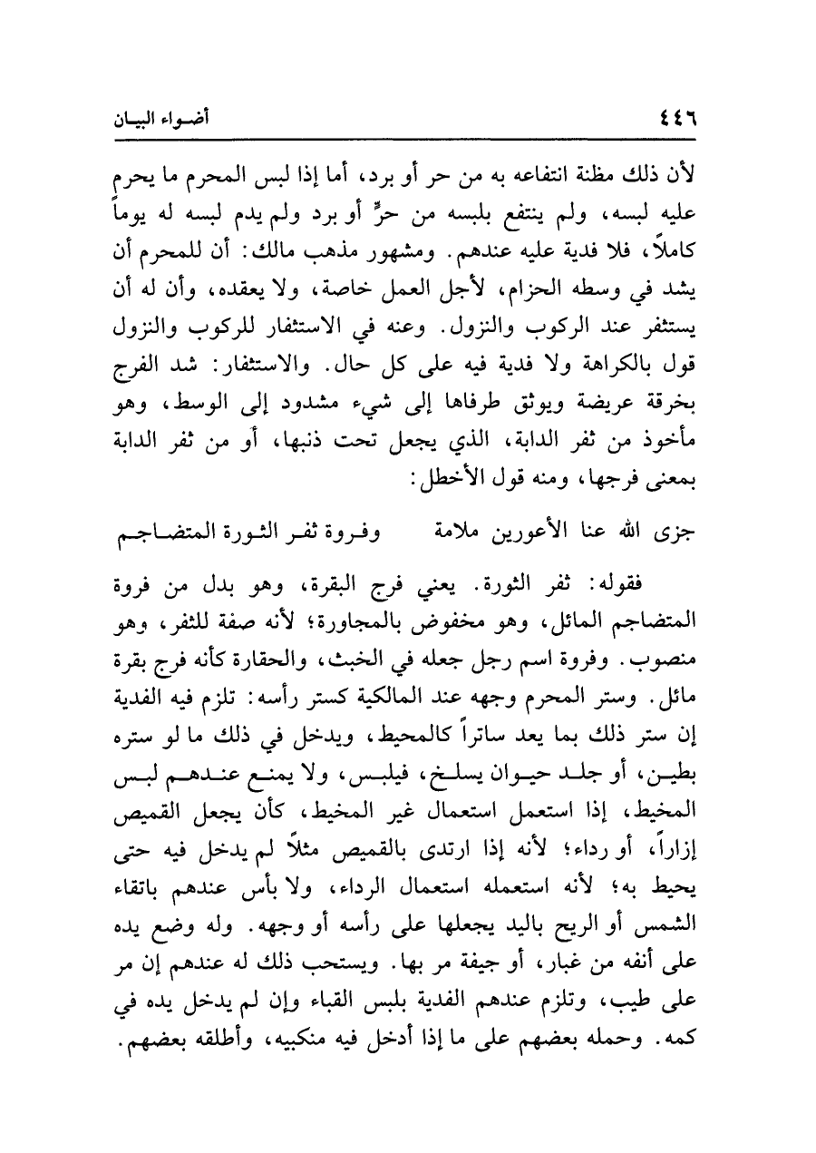 فقوله: ثفر الثورة. يعني فرج البقرة، وهو بدل من فروة المتضاجم المائل، وهو مخفوض بالمجاورة، لأنه صفة للثفر، وهو منصوب. وفروة اسم رجل جعله في الخبث، والحقارة كأنه فرج بقرة مائل. وستر المحرم وجهه عند المالكية كستر رأسه: تلزم فيه الفدية إن ستر ذلك بما يعد ساترًا كالمحيط، ويدخل في ذلك ما لو ستره بطين، أو جلد حيوان يسلخ، فيلبس، ولا يمنع عندهم لبس المخيط، إذا استعمل استعمال غير المخيط، كأن يجعل القميص إزارًا، أو رداء، لأنه إذا ارتدى بالقميص مثلًا لم يدخل فيه حتى يحيط به؛ لأنه استعمله استعمال الرداء، ولا بأس عندهم باتقاء الشمس أو الريح باليد يجعلها على رأسه أو وجهه. وله وضع يده على أنفه من غبار، أو جيفة مر بها. ويستحب ذلك له عندهم إن مر على طيب، وتلزم عندهم الفدية بلبس القباء وإن لم يدخل يده في كمه. وحمله بعضهم على ما إذا أدخل فيه منكبيه، وأطلقه بعضهم.
