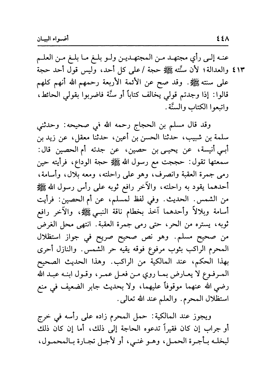 وقد قال مسلم بن الحجاج رحمه الله في صحيحه: وحدثني سلمة بن شبيب، حدثنا الحسن بن أعين، حدثنا معقل، عن زيد بن أبي أنيسة، عن يحيى بن حصين، عن جدته أم الحصين قال: سمعتها تقول: حججت مع رسول الله - صلى الله عليه وسلم - حجة الوداع، فرأيته حين رمى جمرة العقبة وانصرف، وهو على راحلته، ومعه بلال، وأسامة، أحدهما يقود به راحلته، والآخر رافع ثوبه على رأس رسول الله - صلى الله عليه وسلم - من الشمس. الحديث. وفي لفظ لمسلم، عن أم الحصين: فرأيت أسامة وبلالًا وأحدهما آخذ بخطام ناقة النبي - صلى الله عليه وسلم - ، والآخر رافع ثوبه، يستره من الحر، حتى رمى جمرة العقبة. انتهى محل الغرض من صحيح مسلم. وهو نص صحيح صريح في جواز استظلال المحرم الراكب بثوب مرفوع فوقه يقيه حر الشمس. والنازل أحرى بهذا الحكم، عند المالكية من الراكب. وهذا الحديث الصحيح المرفوع لا يعارض بما روي من فعل عمر، وقول ابنه عبد الله رضي الله عنهما موقوفًا عليهما، ولا بحديث جابر الضعيف في منع استظلال المحرم. والعلم عند الله تعالى.