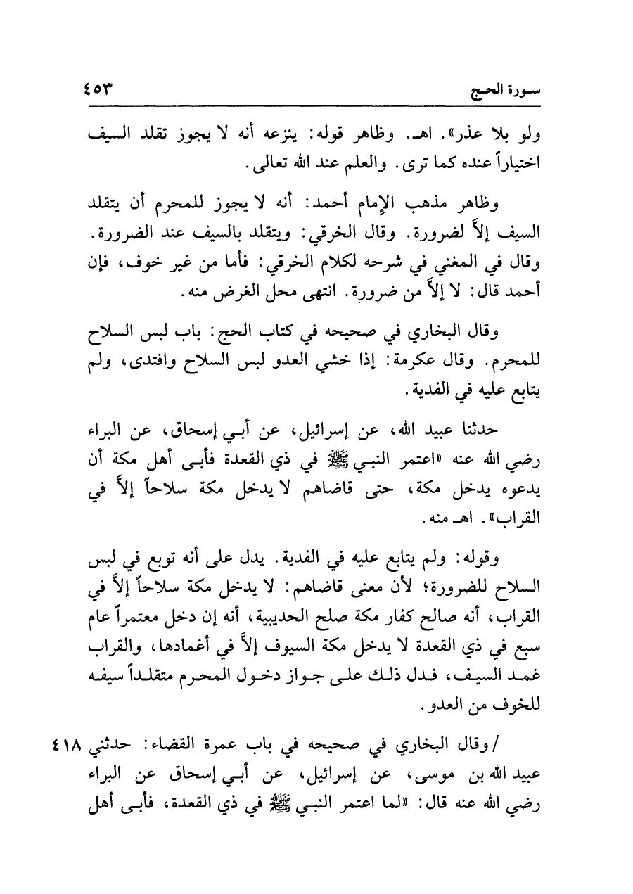 حدثنا عبيد الله، عن إسرائيل، عن أبي إسحاق، عن البراء رضي الله عنه "اعتمر النبي - صلى الله عليه وسلم - في ذي القعدة فأبى أهل مكة أن يدعوه يدخل مكة، حتى قاضاهم لا يدخل مكة سلاحًا إلَّا في القراب". اهـ منه.