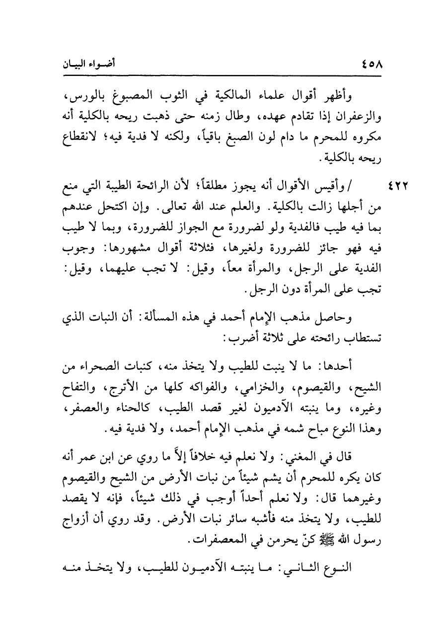 وأقيس الأقوال أنه يجوز مطلقًا؛ لأن الرائحة الطيبة التي منع من أجلها زالت بالكلية. والعلم عند الله تعالى. وإن اكتحل عندهم بما فيه طيب فالفدية ولو لضرورة مع الجواز للضرورة، وبما لا طيب فيه فهو جائز للضرورة ولغيرها، فثلاثة أقوال مشهورها: وجوب الفدية على الرجل، والمرأة معًا، وقيل: لا تجب عليهما، وقيل: تجب على المرأة دون الرجل.