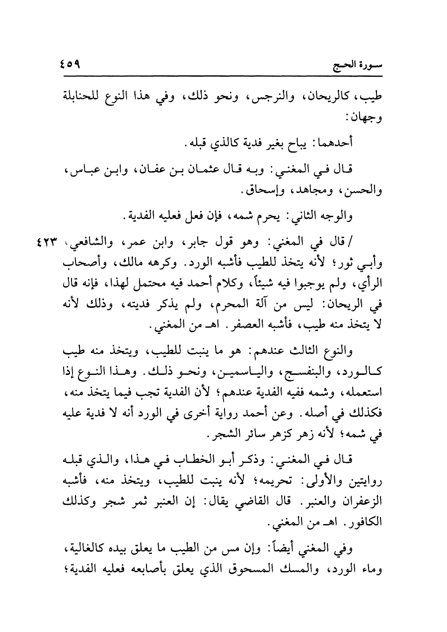 والنوع الثالث عندهم: هو ما ينبت للطيب، ويتخذ منه طيب كالورد، والبنفسج، والياسمين، ونحو ذلك. وهذا النوع إذا استعمله، وشمه ففيه الفدية عندهم؛ لأن الفدية تجب فيما يتخذ منه، فكذلك في أصله. وعن أحمد رواية أخرى في الورد أنه لا فدية عليه في شمه؛ لأنه زهر كزهر سائر الشجر.