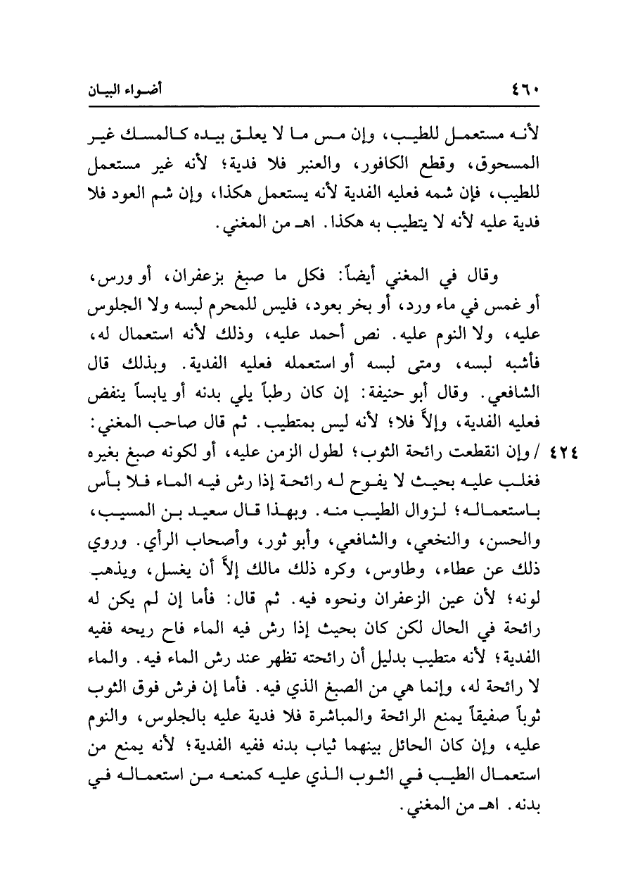 وقال في المغني أيضًا: فكل ما صبغ بزعفران، أو ورس، أو غمس في ماء ورد، أو بخر بعود، فليس للمحرم لبسه ولا الجلوس عليه، ولا النوم عليه. نص أحمد عليه، وذلك لأنه استعمال له، فأشبه لبسه، ومتى لبسه أو استعمله فعليه الفدية. وبذلك قال الشافعي. وقال أبو حنيفة: إن كان رطبًا يلي بدنه أو يابسًا ينفض فعليه الفدية، وإلَّا فلا؛ لأنه ليس بمتطيب. ثم قال صاحب المغني: وإن انقطعت رائحة الثوب، لطول الزمن عليه، أو لكونه صبغ بغيره فغلب عليه بحيث لا يفوح له رائحة إذا رش فيه الماء فلا بأس باستعماله؛ لزوال الطيب منه. وبهذا قال سعيد بن المسيب، والحسن، والنخعي، والشافعي، وأبو ثور، وأصحاب الرأي. وروي ذلك عن عطاء، وطاوس، وكره ذلك مالك إلَّا أن يغسل، ويذهب. لونه؛ لأن عين الزعفران ونحوه فيه. ثم قال: فأما إن لم يكن له رائحة في الحال لكن كان بحيمسا إذا رش فيه الماء فاح ريحه ففيه الفدية؛ لأنه متطيب بدليل أن رائحته تظهر عند رش الماء فيه. والماء لا رائحة له، وإنما هي من الصبغ الذي فيه. فأما إن فرش فوق الثوب ثوبًا صفيقًا يمنع الرائحة والمباشرة فلا فدية عليه بالجلوس، والنوم عليه، وإن كان الحائل بينهما ثياب بدنه ففيه الفدية، لأنه يمنع من استعمال الطيب في الثوب الذي عليه كمنعه من استعماله في بدنه. اهـ من المغني.