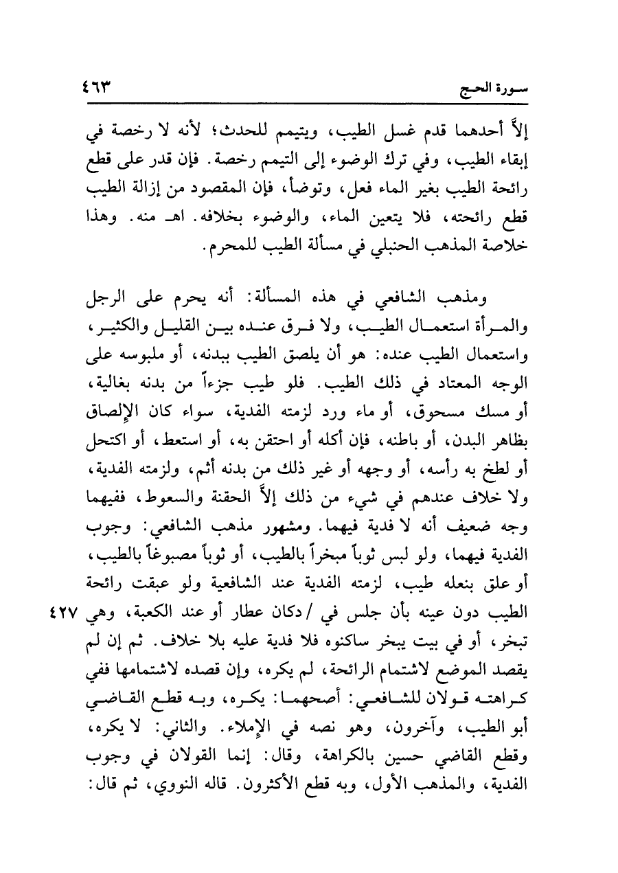 ومذهب الشافعي في هذه المسألة: أنه يحرم على الرجل والمرأة استعمال الطيب، ولا فرق عنده بين القليل والكثير، واستعمال الطيب عنده: هو أن يلصق الطيب ببدنه، أو ملبوسه على الوجه المعتاد في ذلك الطيب. فلو طيب جزءًا من بدنه بغالية، أو مسك مسحوق، أو ماء ورد لزمته الفدية، سواء كان الإِلصاق بظاهر البدن، أو باطنه، فإن أكله أو احتقن به، أو استعط، أو اكتحل أو لطخ به رأسه، أو وجهه أو غير ذلك من بدنه أثم، ولزمته الفدية، ولا خلاف عندهم في شيء من ذلك إلَّا الحقنة والسعوط، ففيهما وجه ضعيف أنه لا فدية فيهما. ومشور مذهب الشافعي: وجوب الفدية فيهما، ولو لبس ثوبًا مبخرًا بالطيب، أو ثوبًا مصبوغًا بالطيب، أو علق بنعله طيب، لزمته الفدية عند الشافعية ولو عبقت رائحة الطيب دون عينه بأن جلس في دكان عطار أو عند الكعبة، وهي تبخر، أو في بيت يبخر ساكنوه فلا فدية عليه بلا خلاف. ثم إن لم يقصد الموضع لاشتمام الرائحة، لم يكره، وإن قصده لاشتمامها ففي كراهته قولان للشافعي: أصحهما: يكره، وبه قطع القاضي أبو الطيب، وآخرون، وهو نصه في الإِملاء. والثاني: لا يكره، وقطع القاضي حسين بالكراهة، وقال: إنما القولان في وجوب الفدية، والمذهب الأول، وبه قطع الأكثرون. قاله النووي، ثم قال: