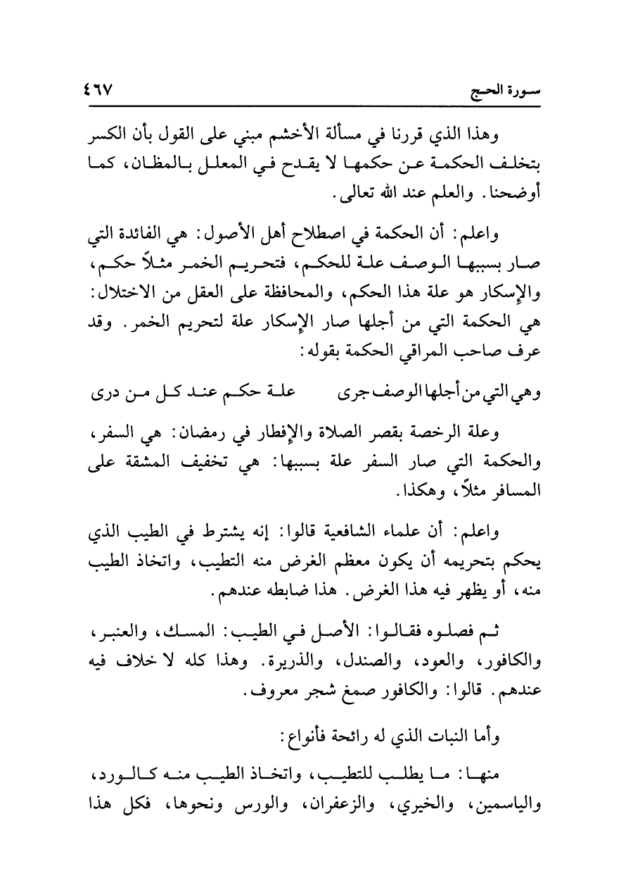 واعلم: أن الحكمة في اصطلاح أهل الأصول: هي الفائدة التي صار بسببها الوصف علة للحكم، فتحريم الخمر مثلًا حكم، والإِسكار هو علة هذا الحكم، والمحافظة على العقل من الاختلال: هي الحكمة التي من أجلها صار الإِسكار علة لتحريم الخمر. وقد عرف صاحب المراقي الحكمة بقوله: