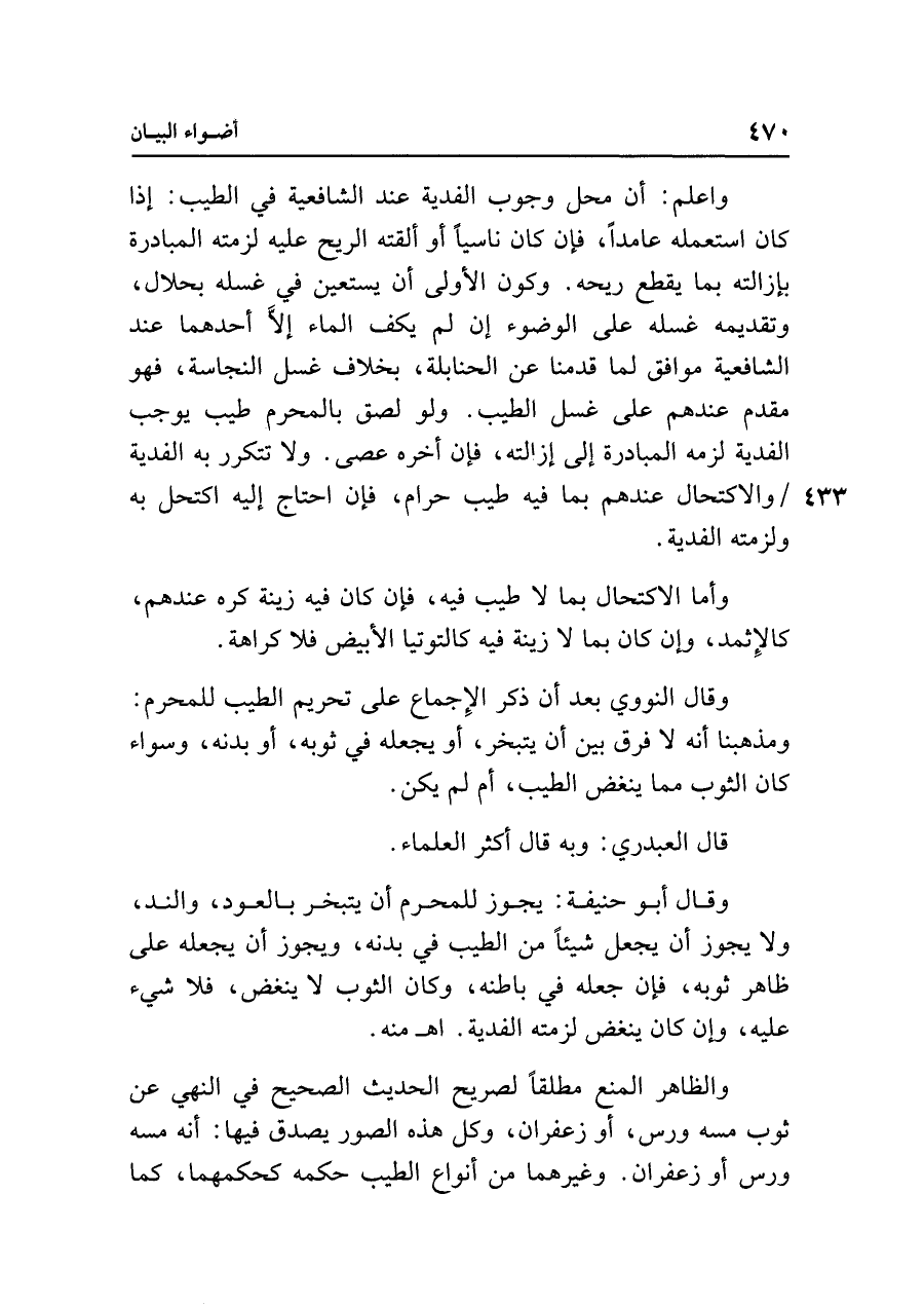 واعلم: أن محل وجوب الفدية عند الشافعية في الطيب: إذا كان استعمله عامدًا، فإن كان ناسيًا أو ألقته الريح عليه لزمته المبادرة بإزالته بما يقطع ريحه. وكون الأولى أن يستعين في غسله بحلال، وتقديمه غسله على الوضوء إن لم يكف الماء إلَّا أحدهما عند الشافعية موافق لما قدمنا عن الحنابلة، بخلاف غسل النجاسة، فهو مقدم عندهم على غسل الطيب. ولو لصق بالمحرم طيب يوجب الفدية لزمه المبادرة إلى إزإلته، فإن أخره عصى. ولا تتكرر به الفدية والاكتحال عندهم بما فيه طيب حرام، فإن احتاج إليه اكتحل به ولزمته الفدية.