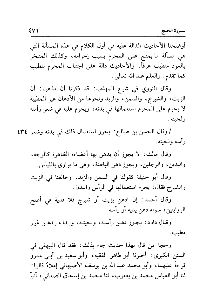 وقال النووي في شرح المهذب: قد ذكرنا أن مذهبنا: أن الزيت، والشيرج، والسمن، والزبد ونحوها من الأدهان غير المطيبة لا يحرم على المحرم استعمالها في بدنه، ويحرم عليه في شعر رأسه ولحيته.