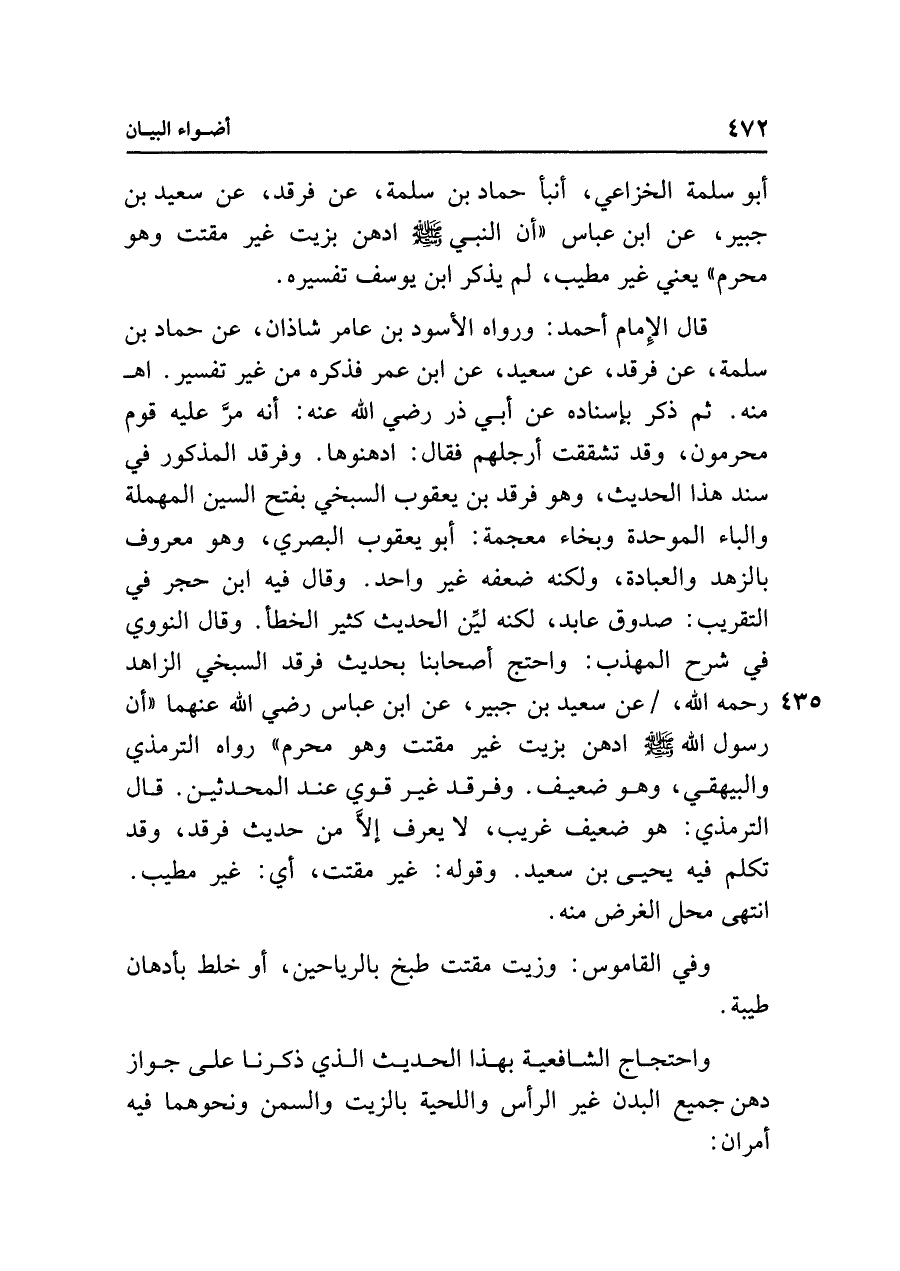قال الإِمام أحمد: ورواه الأسود بن عامر شاذان، عن حماد بن سلمة، عن فرقد، عن سعيد، عن ابن عمر فذكره من غير تفسير. اهـ منه. ثم ذكر بإسناده عن أبي ذر رضي الله عنه: أنه مرَّ عليه قوم محرمون، وقد تشققت أرجلهم فقال: ادهنوها. وفرقد المذكور في سند هذا الحديث، وهو فرقد بن يعقوب السبخي بفتح السين المهملة والباء الموحدة وبخاء معجمة: أبو يعقوب البصري، وهو معروف بالزهد والعبادة، ولكنه ضعفه غير واحد. وقال فيه ابن حجر في التقريب: صدوق عابد، لكنه ليَّن الحديث كثير الخطأ. وقال النووي في شرح المهذب: واحتج أصحابنا بحديث فرقد السبخي الزاهد رحمه الله، عن سعيد بن جبير، عن ابن عباس رضي الله عنهما "أن رسول الله - صلى الله عليه وسلم - ادهن بزيت غير مقتت وهو محرم" رواه الترمذي والبيهقي، وهو ضعيف. وفرقد غير قوي عند المحدثين. قال الترمذي: هو ضعيف غريب، لا يعرف إلَّا من حديث فرقد، وقد تكلم فيه يحيى بن سعيد. وقوله: غير مقتت، أي: غير مطيب. انتهى محل الغرض منه.
