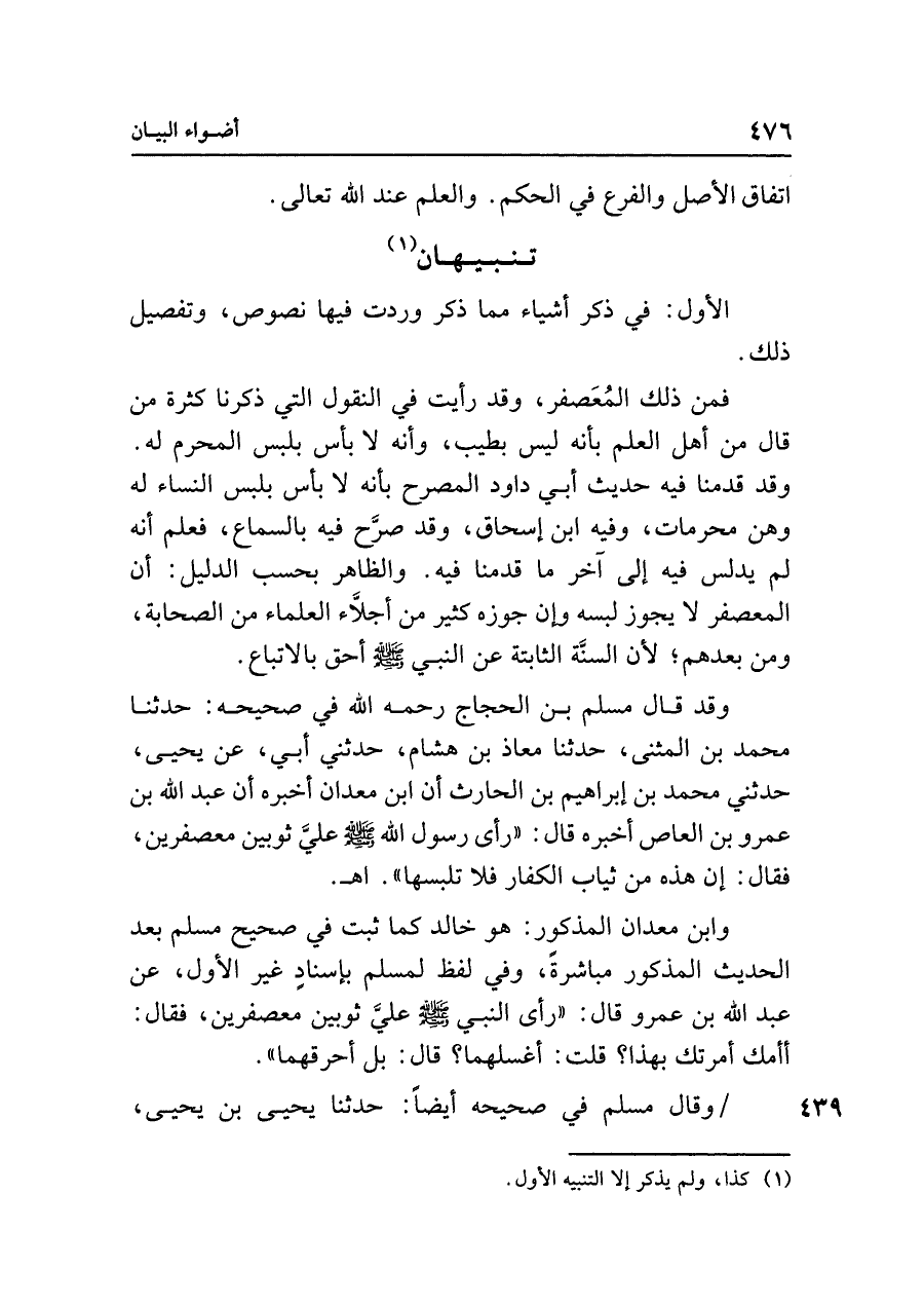 وقد قال مسلم بن الحجاج رحمه الله في صحيحه: حدثنا محمد بن المثنى، حدثنا معاذ بن هشام، حدثني أبي، عن يحيى، حدثني محمد بن إبراهيم بن الحارث أن ابن معدان أخبره أن عبد الله بن عمرو بن العاص أخبره قال: "رأى رسول الله - صلى الله عليه وسلم - عليَّ ثوبين معصفرين، فقال: إن هذه من ثياب الكفار فلا تلبسها". اهـ.
