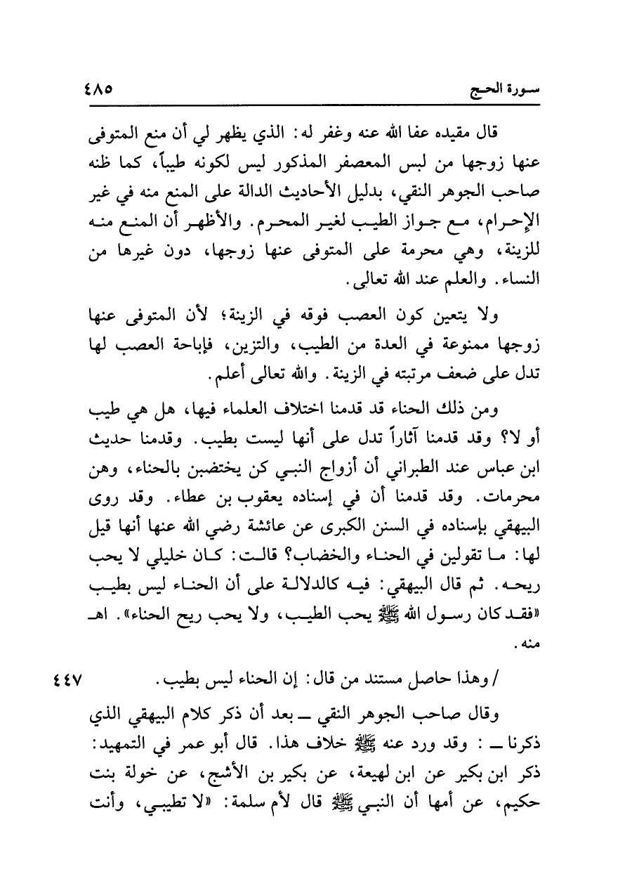 قال مقيده عفا الله عنه وغفر له: الذي يظهر لي أن منع المتوفى عنها زوجها من لبس المعصفر المذكور ليس لكونه طيبًا، كما ظنه صاحب الجوهر النقي، بدليل الأحاديث الدالة على المنع منه في غير الإِحرام، مع جواز الطيب لغير المحرم. والأظهر أن المنع منه للزينة، وهي محرمة على المتوفى عنها زوجها، دون غيرها من النساء. والعلم عند الله تعالى.