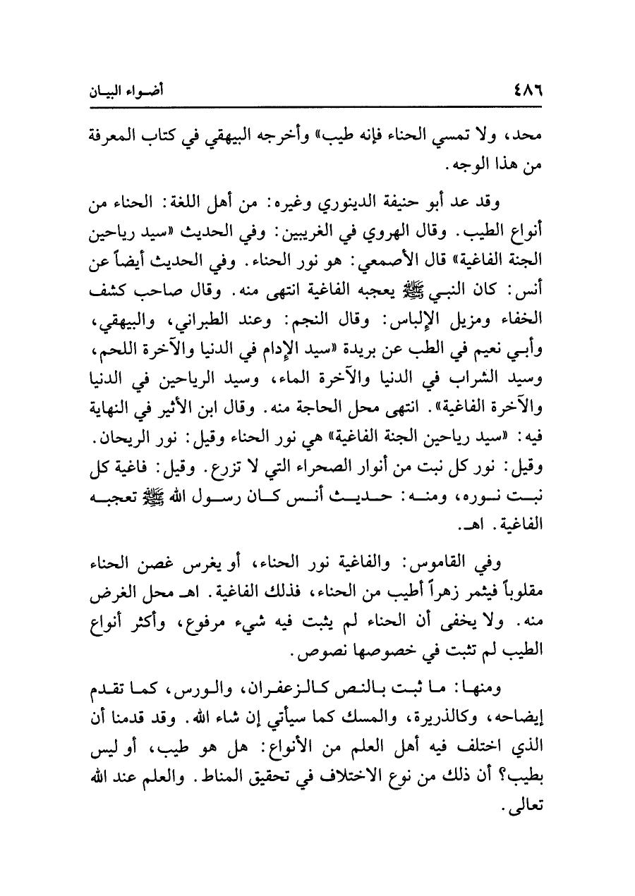 وقد عد أبو حنيفة الدينوري وغيره: من أهل اللغة: الحناء من أنواع الطيب. وقال الهروي في الغريبين: وفي الحديث "سيد رياحين الجنة الفاغية" قال الأصمعي: هو نور الحناء. وفي الحديث أيضًا عن أنس: كان النبي - صلى الله عليه وسلم - يعجبه الفاغية انتهى منه. وقال صاحب كشف الخفاء ومزيل الإِلباس: وقال النجم: وعند الطبراني، والبيهقي، وأبي نعيم في الطب عن بريدة "سيد الإِدام في الدنيا والآخرة اللحم، وسيد الشراب في الدنيا والآخرة الماء، وسيد الرياحين في الدنيا والآخرة الفاغية". انتهى محل الحاجة منه. وقال ابن الأثير في النهاية فيه: "سيد رياحين الجنة الفاغية" هي نور الحناء وقيل: نور الريحان. وقيل: نور كل نبت من أنوار الصحراء التي لا تزرع. وقيل: فاغية كل نبت نوره، ومنه: حديث أنس كان رسول الله - صلى الله عليه وسلم - تعجبة الفاغية. اهـ.