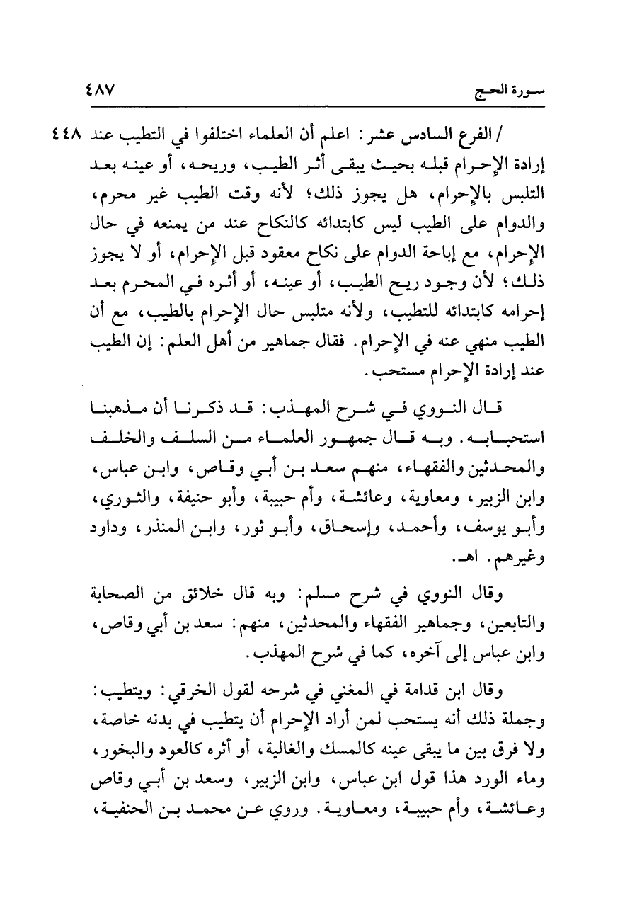الفرع السادس عشر: اعلم أن العلماء اختلفوا في التطيب عند إرادة الإِحرام قبله بحيث يبقى أثر الطيب، وريحه، أو عينه بعد التلبس بالإِحرام، هل يجوز ذلك؛ لأنه وقت الطيب غير محرم، والدوام على الطيب ليس كابتدائه كالنكاح عند من يمنعه في حال الإِحرام، مع إباحة الدوام على نكاح معقود قبل الإِحرام، أو لا يجوز ذلك؛ لأن وجود ريح الطيب، أو عينه، أو أثره في المحرم بعد إحرامه كابتدائه للتطيب، ولأنه متلبس حال الإِحرام بالطيب، مع أن الطيب منهي عنه في الإِحرام. فقال جماهير من أهل العلم: إن الطيب عند إرادة الإِحرام مستحب.