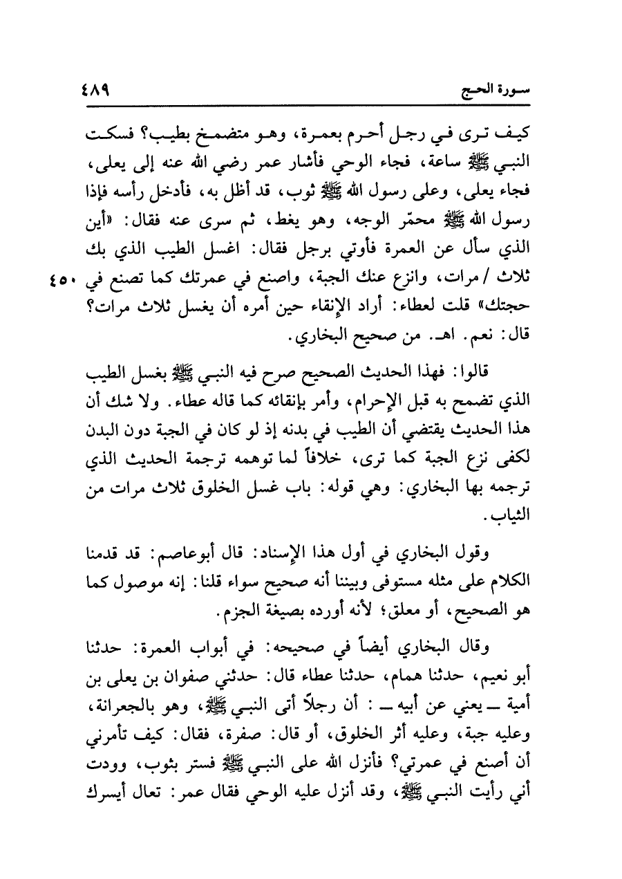 وقال البخاري أيضًا في صحيحه: في أبواب العمرة: حدثنا أبو نعيم، حدثنا همام، حدثنا عطاء قال: حدثني صفوان بن يعلى بن أمية - يعني عن أبيه - : أن رجلًا أتى النبي - صلى الله عليه وسلم - ، وهو بالجعرانة، وعليه جبة، وعليه أثر الخلوق، أو قال: صفرة، فقال: كيف تأمرني أن أصنع في عمرتي؟ فأنزل الله على النبي - صلى الله عليه وسلم - فستر بثوب، وودت أني رأيت النبي - صلى الله عليه وسلم - ، وقد أنزل عليه الوحي فقال عمر: تعال أيسرك