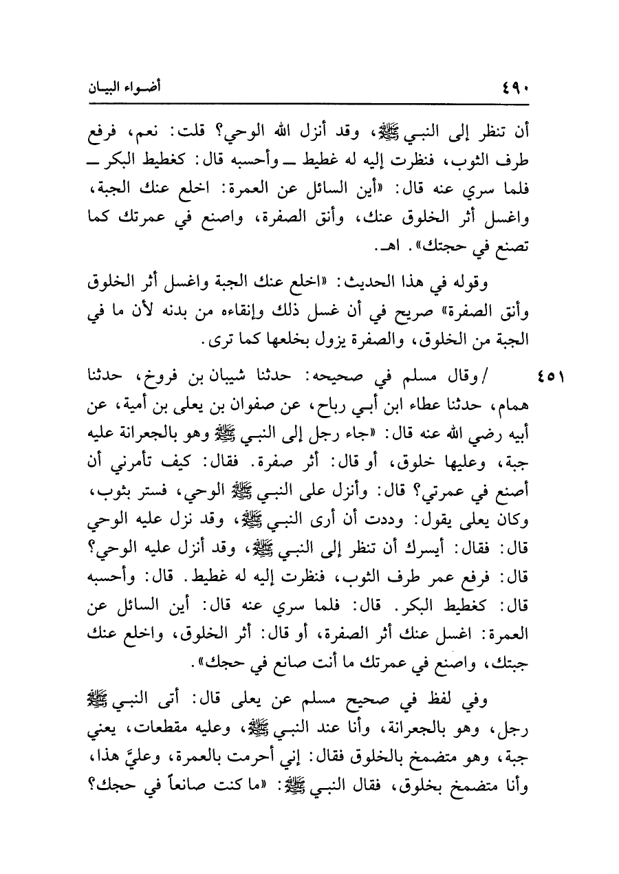 وقال مسلم في صحيحه: حدثنا شيبان بن فروخ، حدثنا همام، حدثنا عطاء ابن أبي رباح، عن صفوان بن يعلى بن أمية، عن أبيه رضي الله عنه قال: "جاء رجل إلى النبي - صلى الله عليه وسلم - وهو بالجعرانة عليه جبة، وعليها خلوق، أو قال: أثر صفرة. فقال: كيف تأمرني أن أصنع في عمرتي؟ قال: وأنزل على النبي - صلى الله عليه وسلم - الوحي، فستر بثوب، وكان يعلى يقول: وددت أن أرى النبي - صلى الله عليه وسلم - ، وقد نزل عليه الوحي قال: فقال: أيسرك أن تنظر إلى النبي - صلى الله عليه وسلم - ، وقد أنزل عليه الوحي؟ قال: فرفع عمر طرف الثوب، فنظرت إليه له غطيط. قال: وأحسبه قال: كغطيط البكر. قال: فلما سري عنه قال: أين السائل عن العمرة: اغسل عنك أثر الصفرة، أو قال: أثر الخلوق، واخلع عنك جبتك، واصنع في عمرتك ما أنت صانع في حجك".