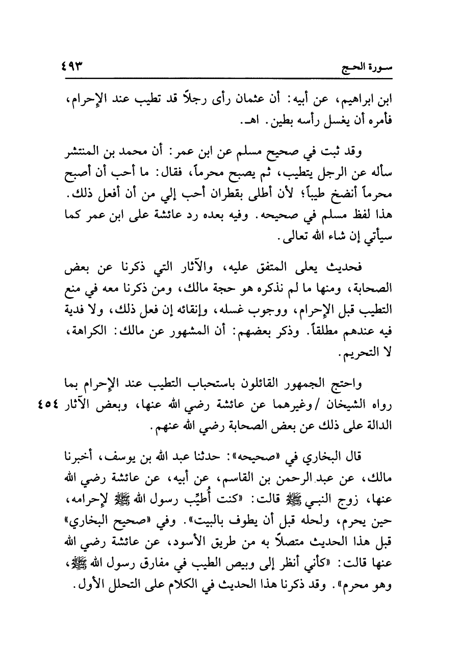 وقد ثبت في صحيح مسلم عن ابن عمر: أن محمد بن المنتشر سأله عن الرجل يتطيب، ثم يصبح محرمًا، فقال: ما أحب أن أصبح محرمًا أنضخ طيبًا؛ لأن أطلى بقطران أحب إلي من أن أفعل ذلك. هذا لفظ مسلم في صحيحه. وفيه بعده رد عائشة على ابن عمر كما سيأتي إن شاء الله تعالى.