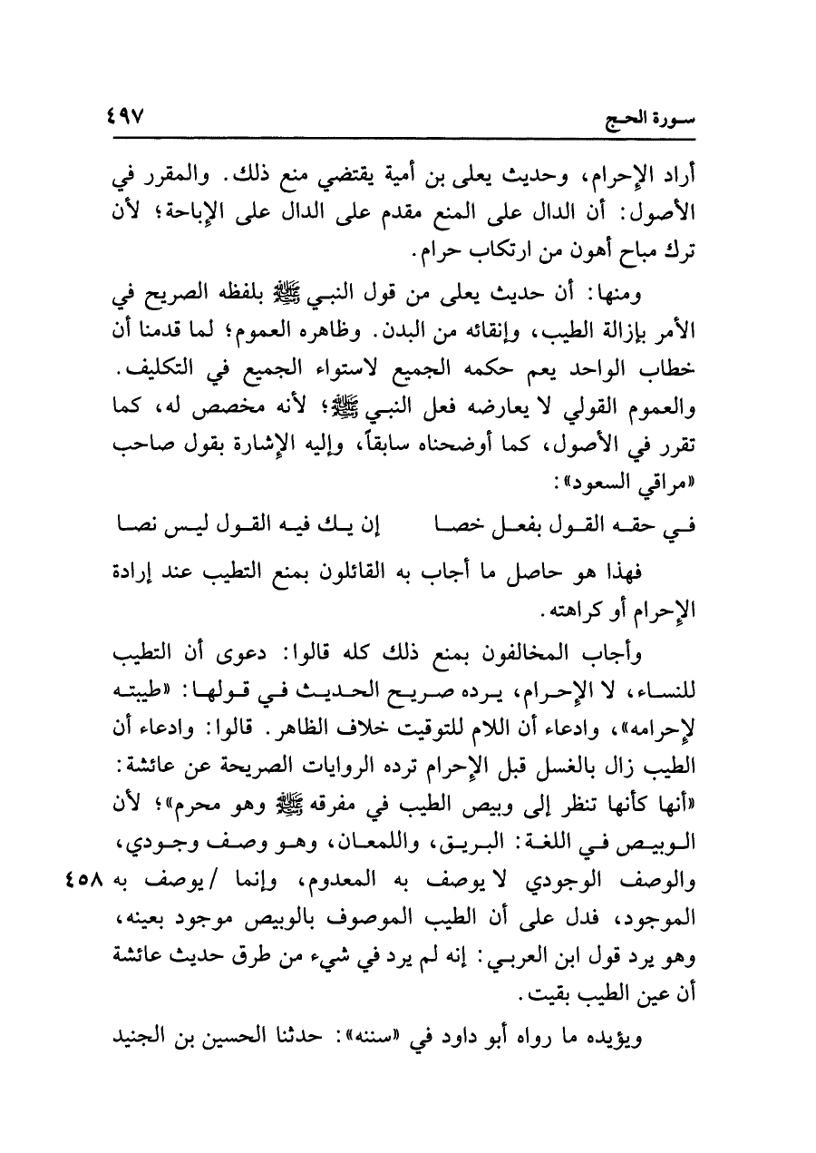 ومنها: أن حديث يعلى من قول النبي - صلى الله عليه وسلم - بلفظه الصريح في الأمر بإزالة الطيب، وإنقائه من البدن. وظاهره العموم؛ لما قدمنا أن خطاب الواحد يعم حكمه الجميع لاستواء الجميع في التكليف. والعموم القولي لا يعارضه فعل النبي - صلى الله عليه وسلم -؛ لأنه مخصص له، كما تقرر في الأصول، كما أوضحناه سابقًا، وإليه الإشارة بقول صاحب "مراقي السعود":