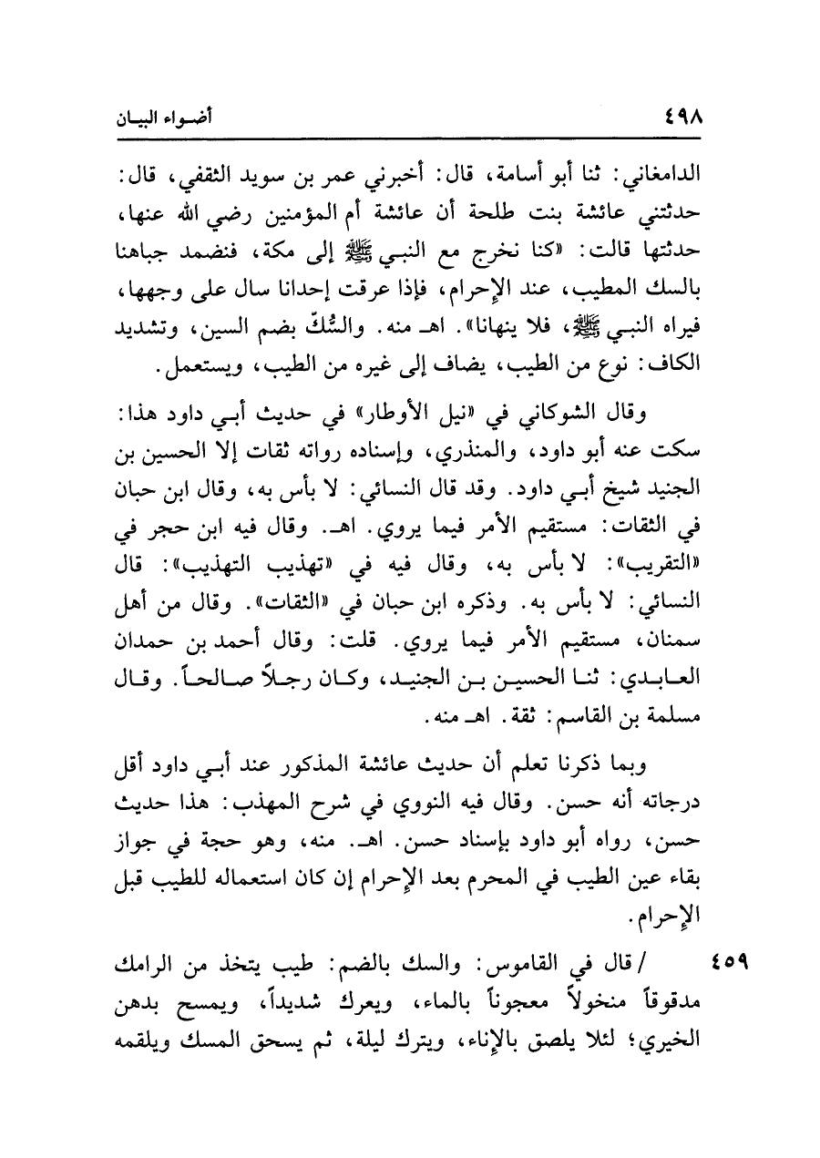 وبما ذكرنا تعلم أن حديث عائشة المذكور عند أبي داود أقل درجاته أنه حسن. وقال فيه النووي في شرح المهذب: هذا حديث حسن، رواه أبو داود بإسناد حسن. اهـ. منه، وهو حجة في جواز بقاء عين الطيب في المحرم بعد الإِحرام إن كان استعماله للطيب قبل الإِحرام.