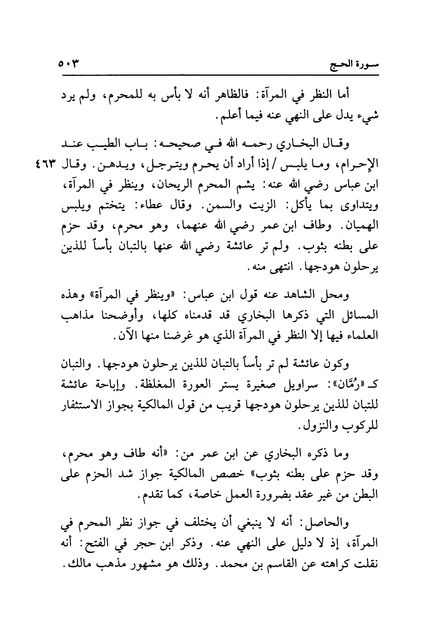 ومحل الشاهد عنه قول ابن عباس: "وينظر في المرآة" وهذه المسائل التي ذكرها البخاري قد قدمناه كلها، وأوضحنا مذاهب العلماء فيها إلا النظر في المرآة الذي هو غرضنا منها الآن.