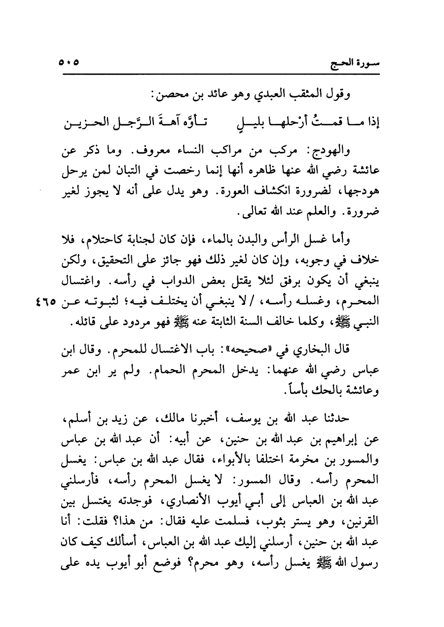 حدثنا عبد الله بن يوسف، أخبرنا مالك، عن زيد بن أسلم، عن إبراهيم بن عبد الله بن حنين، عن أبيه: أن عبد الله بن عباس والمسور بن مخرمة اختلفا بالأبواء، فقال عبد الله بن عباس: يغسل المحرم رأسه. وقال المسور: لا يغسل المحرم رأسه، فأرسلني عبد الله بن العباس إلى أبي أيوب الأنصاري، فوجدته يغتسل بين القرنين، وهو يستر بثوب، فسلمت عليه فقال: من هذا؟ فقلت: أنا عبد الله بن حنين، أرسلني إليك عبد الله بن العباس، أسألك كيف كان رسول الله - صلى الله عليه وسلم - يغسل رأسه، وهو محرم؟ فوضع أبو أيوب يده على