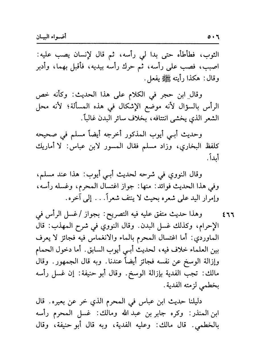 وهذا حديث متفق عليه فيه التصريح: بجواز غسل الرأس في الإِحرام، وكذلك غسل البدن. وقال النووي في شرح المهذب: قال الماوردي: أما اغتسال المحرم بالماء والانغماس فيه فجائز لا يعرف بين العلماء خلاف فيه، لحديث أبي أيوب السابق. أما دخول الحمام وإزالة الوسخ عن نفسه فجائز أيضًا عندنا. وبه قال الجمهور. وقال مالك: تجب الفدية بإزالة الوسخ. وقال أبو حنيفة: إن غسل رأسه بخطمي لزمته الفدية.