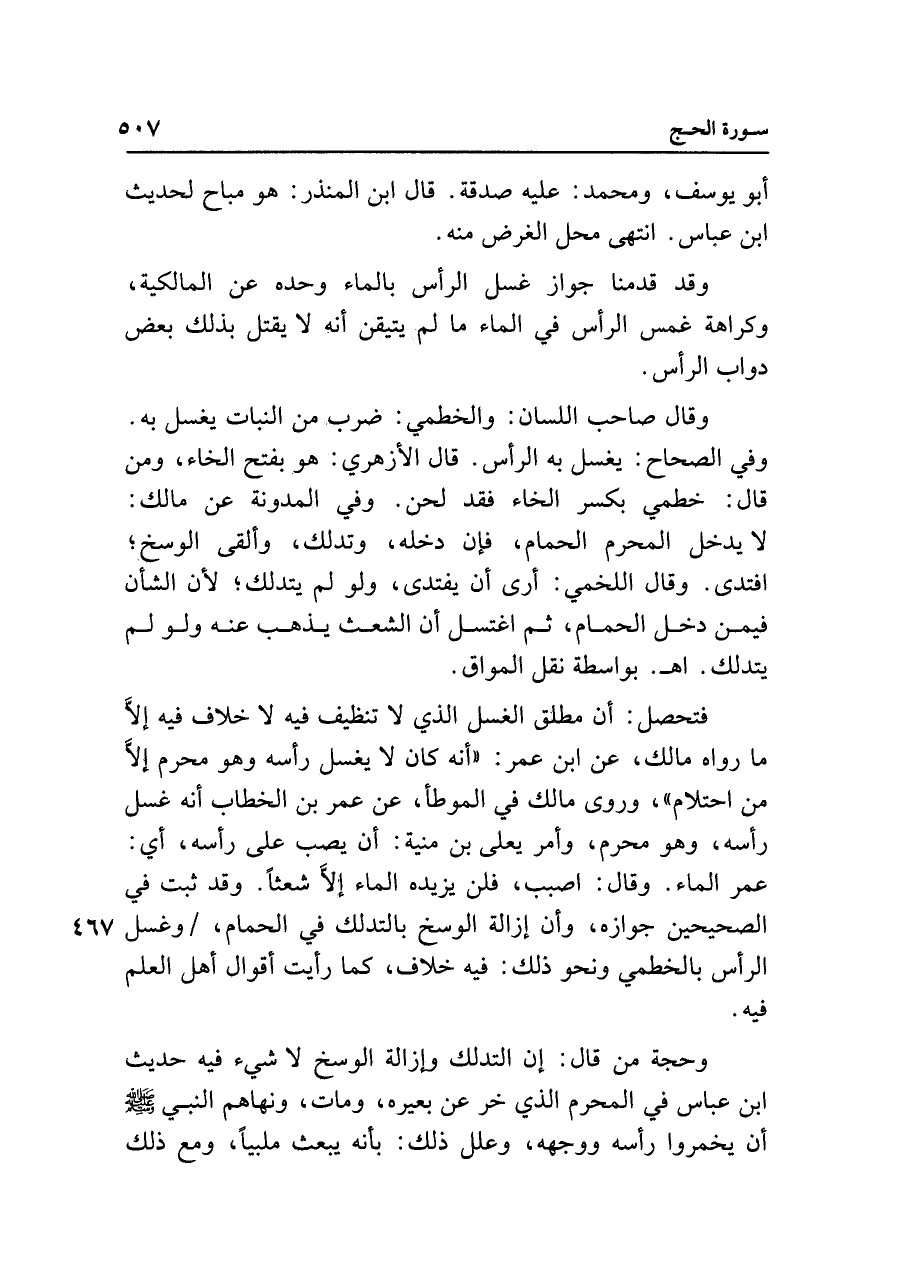 فتحصل: أن مطلق الغسل الذي لا تنظيف فيه لا خلاف فيه إلَّا ما رواه مالك، عن ابن عمر: "أنه كان لا يغسل رأسه وهو محرم إلَّا من احتلام"، وروى مالك في الموطأ، عن عمر بن الخطاب أنه غسل رأسه، وهو محرم، وأمر يعلى بن منية: أن يصب على رأسه، أي: عمر الماء. وقال: اصبب، فلن يزيده الماء إلَّا شعثًا. وقد ثبت في الصحيحين جوازه، وأن إزالة الوسخ بالتدلك في الحمام، وغسل الرأس بالخطمي ونحو ذلك: فيه خلاف، كما رأيت أقوال أهل العلم فيه.