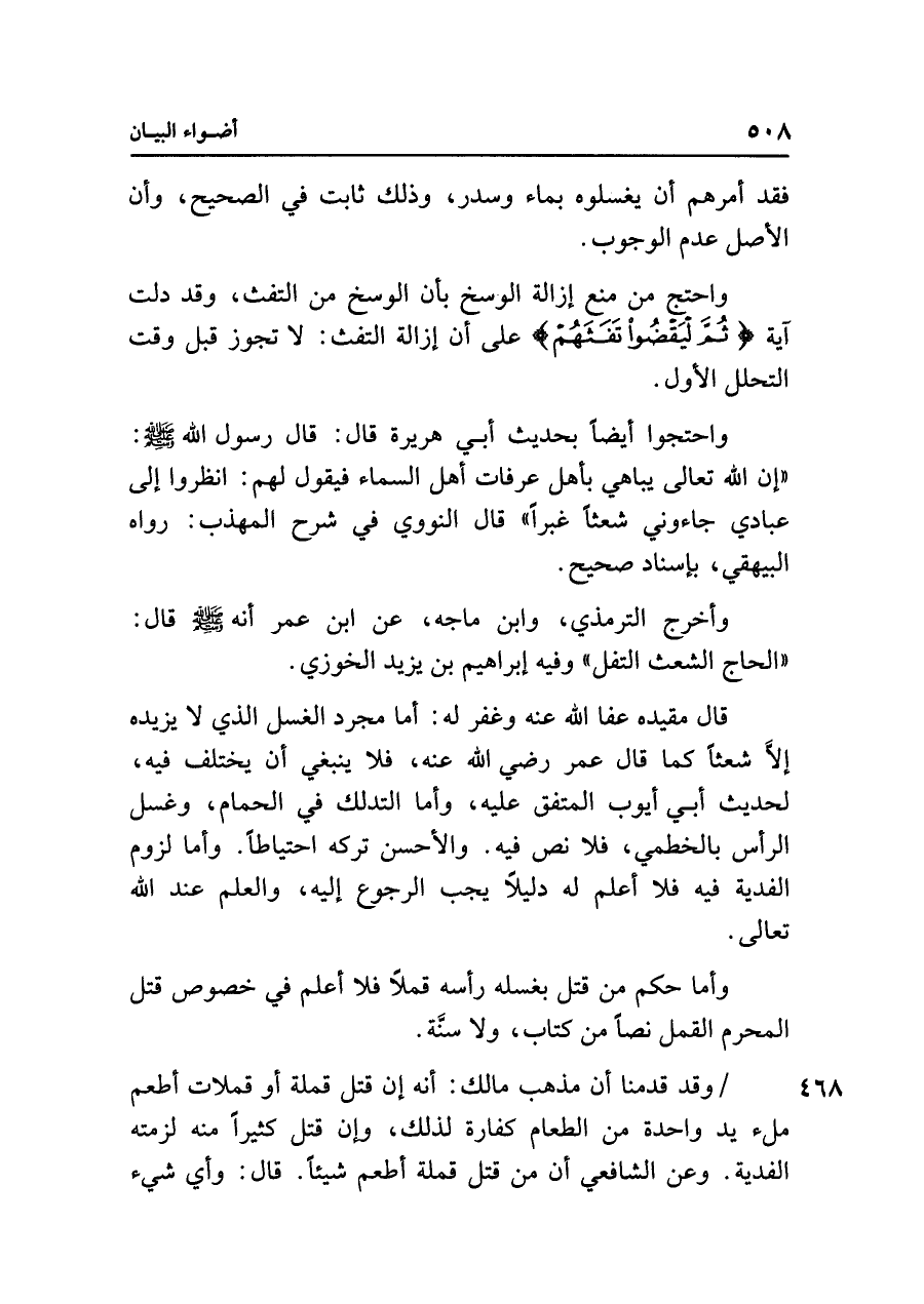 واحتج من منع إزالة الوسخ بأن الوسخ من التفث، وقد دلت آية {ثُمَّ لْيَقْضُوا تَفَثَهُمْ} على أن إزالة التفث: لا تجوز قبل وقت التحلل الأول.
