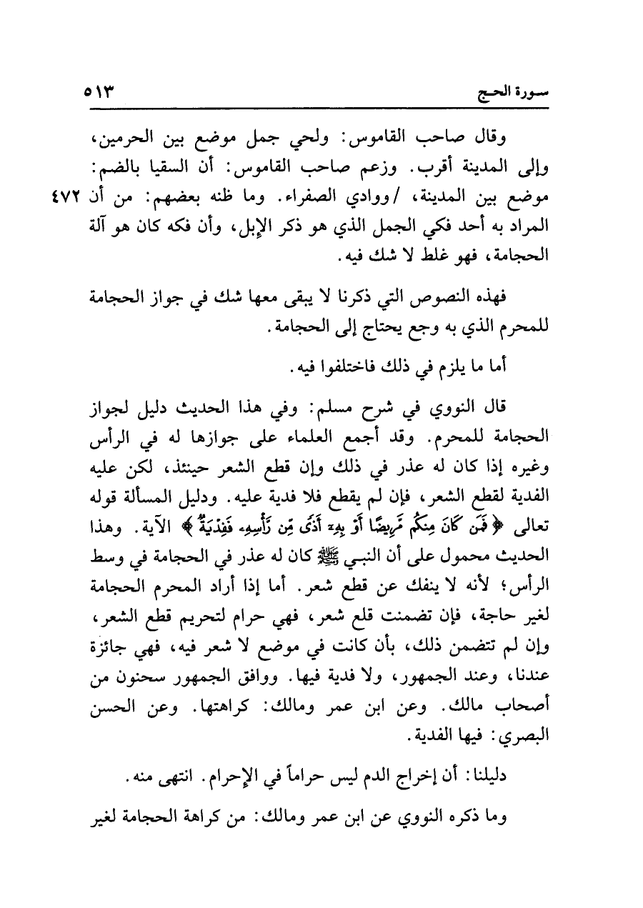 قال النووي في شرح مسلم: وفي هذا الحديث دليل لجواز الحجامة للمحرم. وقد أجمع العلماء على جوازها له في الرأس وغيره إذا كان له عذر في ذلك وإن قطع الشعر حينئذ، لكن عليه الفدية لقطع الشعر، فإن لم يقطع فلا فدية عليه. ودليل المسألة قوله تعالى {فَمَنْ كَانَ مِنْكُمْ مَرِيضًا أَوْ بِهِ أَذًى مِنْ رَأْسِهِ فَفِدْيَةٌ} الآية. وهذا الحديث محمول على أن النبي - صلى الله عليه وسلم - كان له عذر في الحجامة في وسط الرأس؛ لأنه لا ينفك عن قطع شعر. أما إذا أراد المحرم الحجامة لغير حاجة، فإن تضمنت قلع شعر، فهي حرام لتحريم قطع الشعر، وإن لم تتضمن ذلك، بأن كانت في موضع لا شعر فيه، فهي جائزة عندنا، وعند الجمهور، ولا فدية فيها. ووافق الجمهور سحنون من أصحاب مالك. وعن ابن عمر ومالك: كراهتها. وعن الحسن البصري: فيها الفدية.