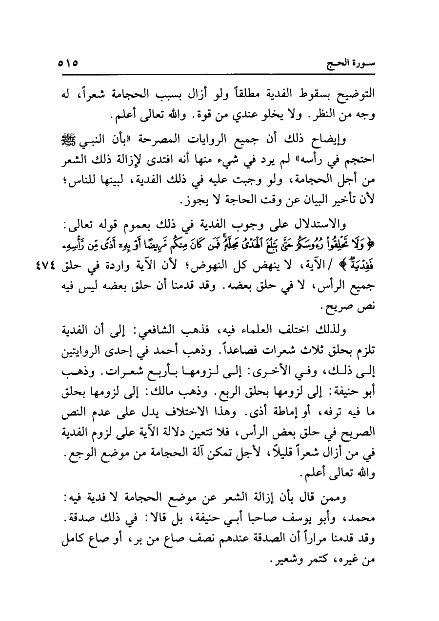 ولذلك اختلف العلماء فيه، فذهب الشافعي: إلى أن الفدية تلزم بحلق ثلاث شعرات فصاعدًا. وذهب أحمد في إحدى الروايتين إلى ذلك، وفي الأخرى: إلى لزومها بأربع شعرات. وذهب أبو حنيفة: إلى لزومها بحلق الربع. وذهب مالك: إلى لزومها بحلق ما فيه ترفه، أو إماطة أذى. وهذا الاختلاف يدل على عدم النص الصريح في حلق بعض الرأس، فلا تتعين دلالة الآية على لزوم الفدية في من أزال شعرًا قليلًا، لأجل تمكن آلة الحجامة من موضع الوجع. واللَّه تعالى أعلم.