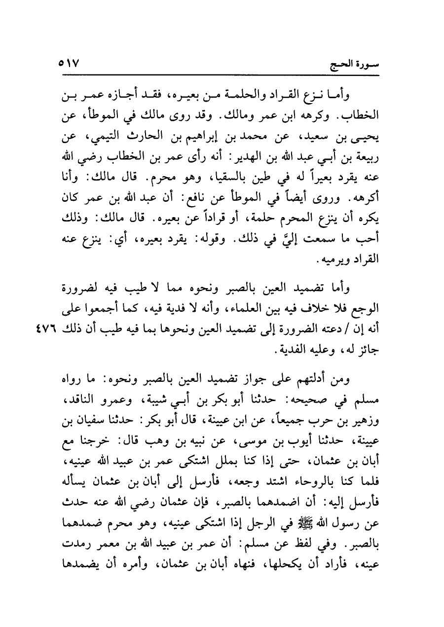 وأما نزع القراد والحلمة من بعيره، فقد أجازه عمر بن الخطاب. وكرهه ابن عمر ومالك. وقد روى مالك في الموطأ، عن يحيى بن سعيد، عن محمد بن إبراهيم بن الحارث التيمي، عن ربيعة بن أبي عبد الله بن الهدير: أنه رأى عمر بن الخطاب رضي الله عنه يقرد بعيرًا له في طين بالسقيا، وهو محرم. قال مالك: وأنا أكرهه. وروى أيضًا في الموطأ عن نافع: أن عبد الله بن عمر كان يكره أن ينزع المحرم حلمة، أو قرادًا عن بعيره. قال مالك: وذلك أحب ما سمعت إليَّ في ذلك. وقوله: يقرد بعيره، أي: ينزع عنه القراد ويرميه.
