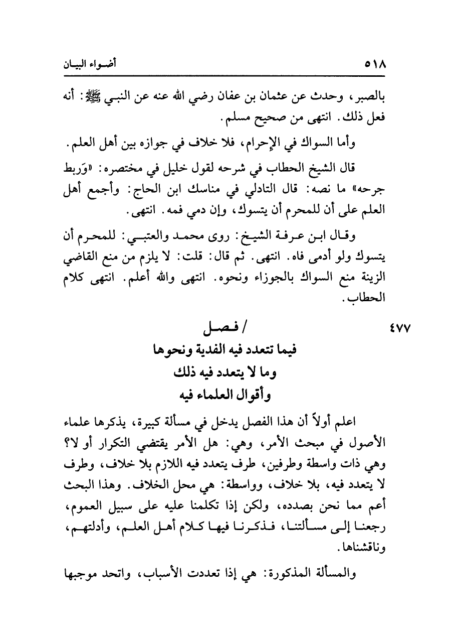 فصل فيما تتعدد فيه الفدية ونحوها وما لا يتعدد فيه ذلك وأقوال العلماء فيه