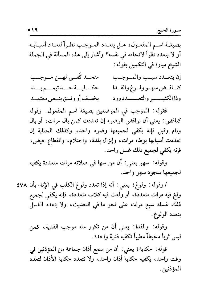 بصيغة اسم المفعول، هل يتعدد الموجب نظرًا لتعدد أسبابه أو لا يتعدد نظرًا لاتحاده في نفسه؟ وأشار إلى هذه المسألة في الجملة الشيخ ميارة في التكميل بقوله: