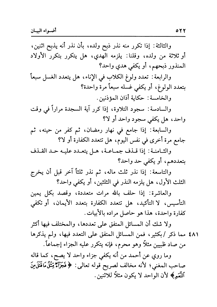 ولا شك أن المسائل المتفق على تعددها، والمختلف فيها أكثر مما ذكر بكثير، فمن المسائل المتفق على التعدد فيها، ولم يذكرها من صاد ظبيين مثلًا وهو محرم، فإنه يتكرر عليه الجزاء إجماعًا.