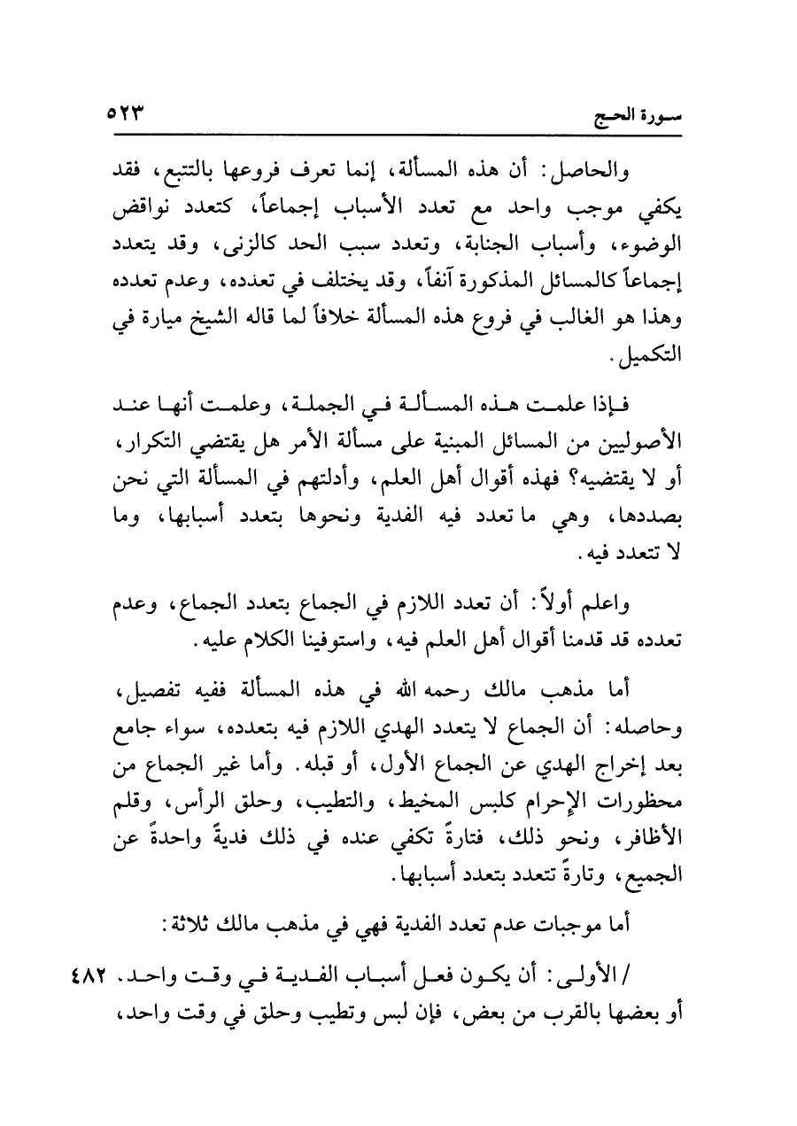 فإذا علمت هذه المسألة في الجملة، وعلمت أنها عند الأصوليين من المسائل المبنية على مسألة الأمر هل يقتضي التكرار، أو لا يقتضيه؟ فهذه أقوال أهل العلم، وأدلتهم في المسألة التي نحن بصددها، وهي ما تعدد فيه الفدية ونحوها بتعدد أسبابها، وما لا تتعدد فيه.