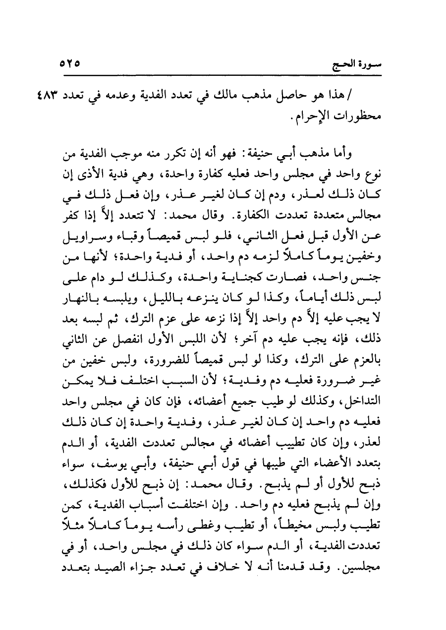وأما مذهب أبي حنيفة: فهو أنه إن تكرر منه موجب الفدية من نوع واحد في مجلس واحد فعليه كفارة واحدة، وهي فدية الأذى إن كان ذلك لعذر، ودم إن كان لغير عذر، وإن فعل ذلك في مجالس متعددة تعددت الكفارة. وقال محمد: لا تتعدد إلَّا إذا كفر عن الأول قبل فعل الثاني، فلو لبس قميصًا وقباء وسراويل وخفين يومًا كاملًا لزمه دم واحد، أو فدية واحدة؛ لأنها من جنس واحد، فصارت كجناية واحدة، وكذلك لو دام على لبس ذلك أيامًا، وكذا لو كان ينزعه بالليل، ويلبسه بالنهار لا يجب عليه إلَّا دم واحد إلَّا إذا نزعه على عزم الترك، ثم لبسه بعد ذلك، فإنه يجب عليه دم آخر؛ لأن اللبس الأول انفصل عن الثاني بالعزم على الترك، وكذا لو لبس قميصًا للضرورة، ولبس خفين من غير ضرورة فعليه دم وفدية؛ لأن السبب اختلف فلا يمكن التداخل، وكذلك لو طيب جميع أعضائه، فإن كان في مجلس واحد فعليه دم واحد إن كان لغير عذر، وفدية واحدة إن كان ذلك لعذر، وإن كان تطييب أعضائه في مجالس تعددت الفدية، أو الدم بتعدد الأعضاء التي طيبها في قول أبي حنيفة، وأبي يوسف، سواء ذبح للأول أولم يذبح. وقال محمد: إن ذبح للأول فكذلك، وإن لم يذبح فعليه دم واحد. وإن اختلفت أسباب الفدية، كمن تطيب ولبس مخيطًا، أو تطيب وغطى رأسه يومًا كاملًا مثلًا تعددت الفدية، أو الدم سواء كان ذلك في مجلس واحد، أو في مجلسين. وقد قدمنا أنه لا خلاف في تعدد جزاء الصيد بتعدد