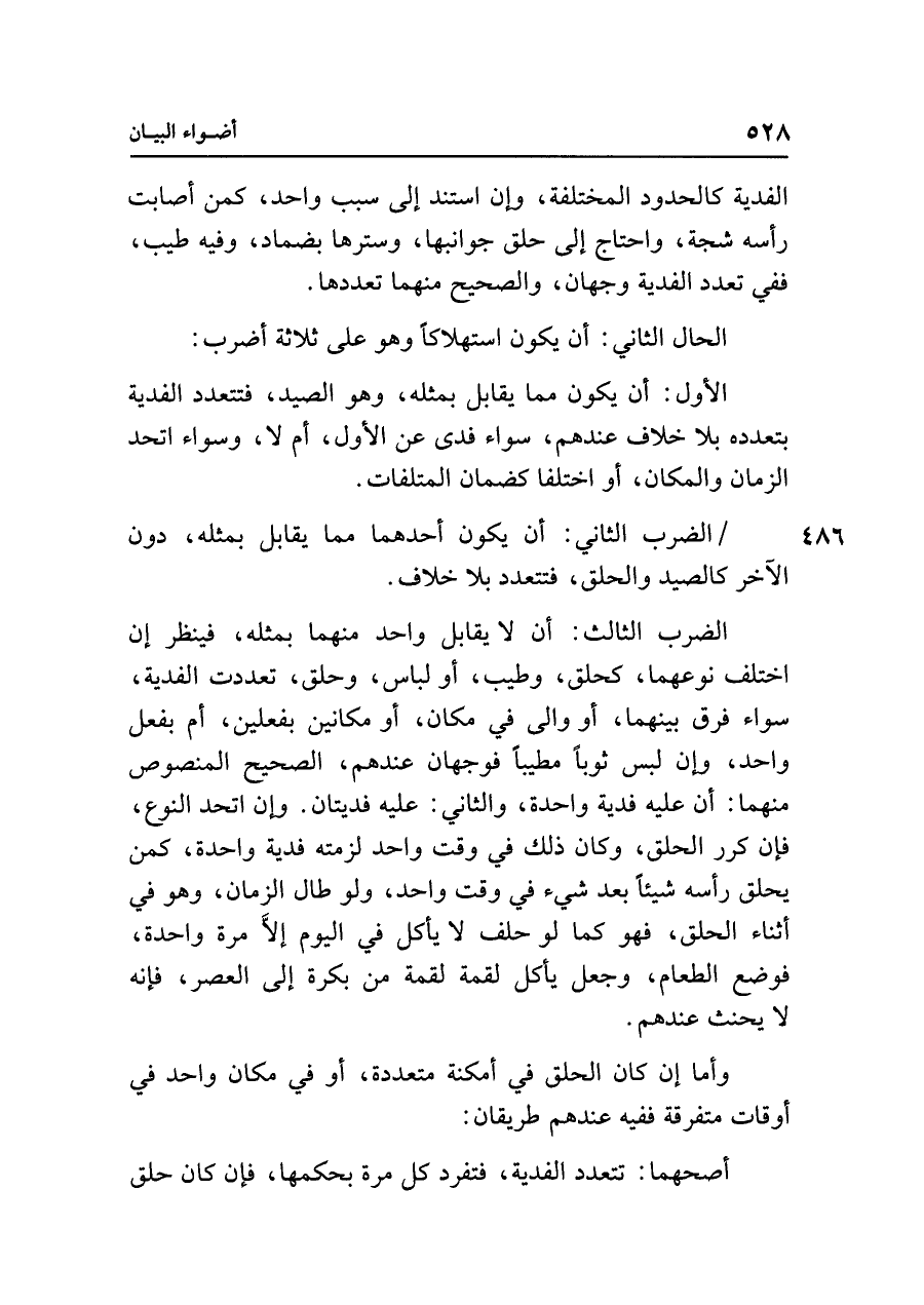 الضرب الثالث: أن لا يقابل واحد منهما بمثله، فينظر إن اختلف نوعهما، كحلق، وطيب، أو لباس، وحلق، تعددت الفدية، سواء فرق بينهما، أو والى في مكان، أو مكانين بفعلين، أم بفعل واحد، وإن لبس ثوبًا مطيبًا فوجهان عندهم، الصحيح المنصوص منهما: أن عليه فدية واحدة، والثاني: عليه فديتان. وإن اتحد النوع، فإن كرر الحلق، وكان ذلك في وقت واحد لزمته فدية واحدة، كمن يحلق رأسه شيئًا بعد شيء في وقت واحد، ولو طال الزمان، وهو في أثناء الحلق، فهو كما لو حلف لا يأكل في اليوم إلَّا مرة واحدة، فوضع الطعام، وجعل يأكل لقمة لقمة من بكرة إلى العصر، فإنه لا يحنث عندهم.